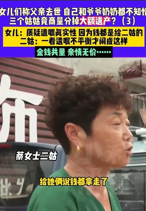 侄女说,父母离婚多年,我们是与爷爷奶奶一起长大,只有过年的时候,父亲才会去爷爷奶奶家与我们见上一面。 两个侄女找到二妹妹索要父亲的遗产,二妹妹拿出来哥哥的遗嘱。说自己拿这些遗产有理有据,立遗嘱的时候有律师在场。 遗嘱是哥哥去世前两天立的,遗嘱的真实性有待确认。 并且二妹妹说其他两个妹妹:“事是咱们三个一起商量的,你们就是看我拿的多,才反悔的吧。” 小妹妹和大妹妹回道:“我们是拿了这个钱,寝食难安、良心过不去,才告诉侄女们的。”