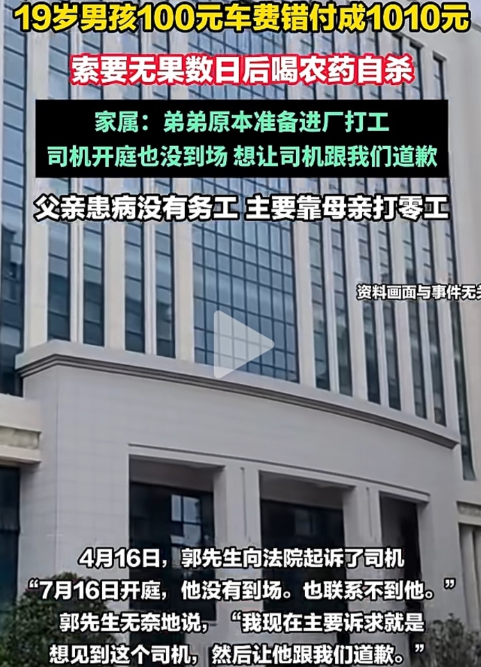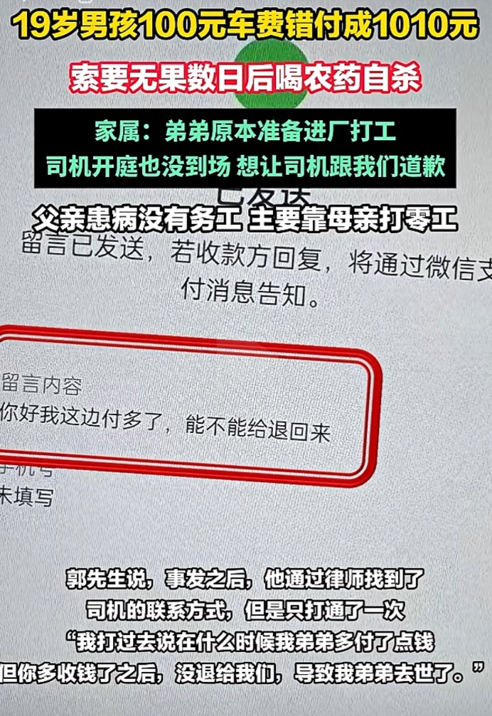 河南19岁男孩在上海打车将100元车费付错成1010元后,他喝下了半瓶敌敌畏,最终身亡![流泪]