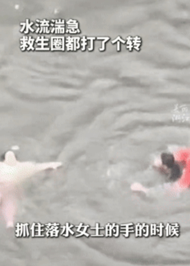 而最让人没想到的是,落水的大姐却没有像一般人那样慌张挣扎,也没有拼命喊救命,她居然很快调整姿势,四肢打开,身体平躺在水面上,像一个“大”字那样仰漂着,任水流带着她往下冲。
