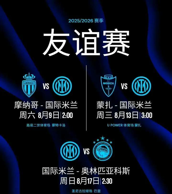 随着各种日程的宣布,2025/26赛季即将启程。 -7月26日,在BPER训练中心重新集结,开始季前训练。 -7月28日-8月9日,目前没有特殊计划,应该就是内部训练,演练战术等。 接下来就是三场热身赛,分别是: -8月9日凌晨2:00:摩纳哥 vs 国际米兰(路易二世球场) -8月13日 周三 凌晨3:00:蒙扎 vs 国际米兰(新势力球场) -8月17日 周日 凌晨2:30:国际米兰 vs 奥林匹亚科斯(圣尼科拉球场,巴里) 这一系列安排结束后,国米就将正式开启2025/26赛季的意甲联赛。首轮比赛将在8月25日周一主场迎战都灵。 没有比赛的日子太无聊了,有了日程安排,就好像有了盼头,熬夜看球的日子就快来了。 #国米# #国际米兰# #新赛季季前赛# #国米比赛#