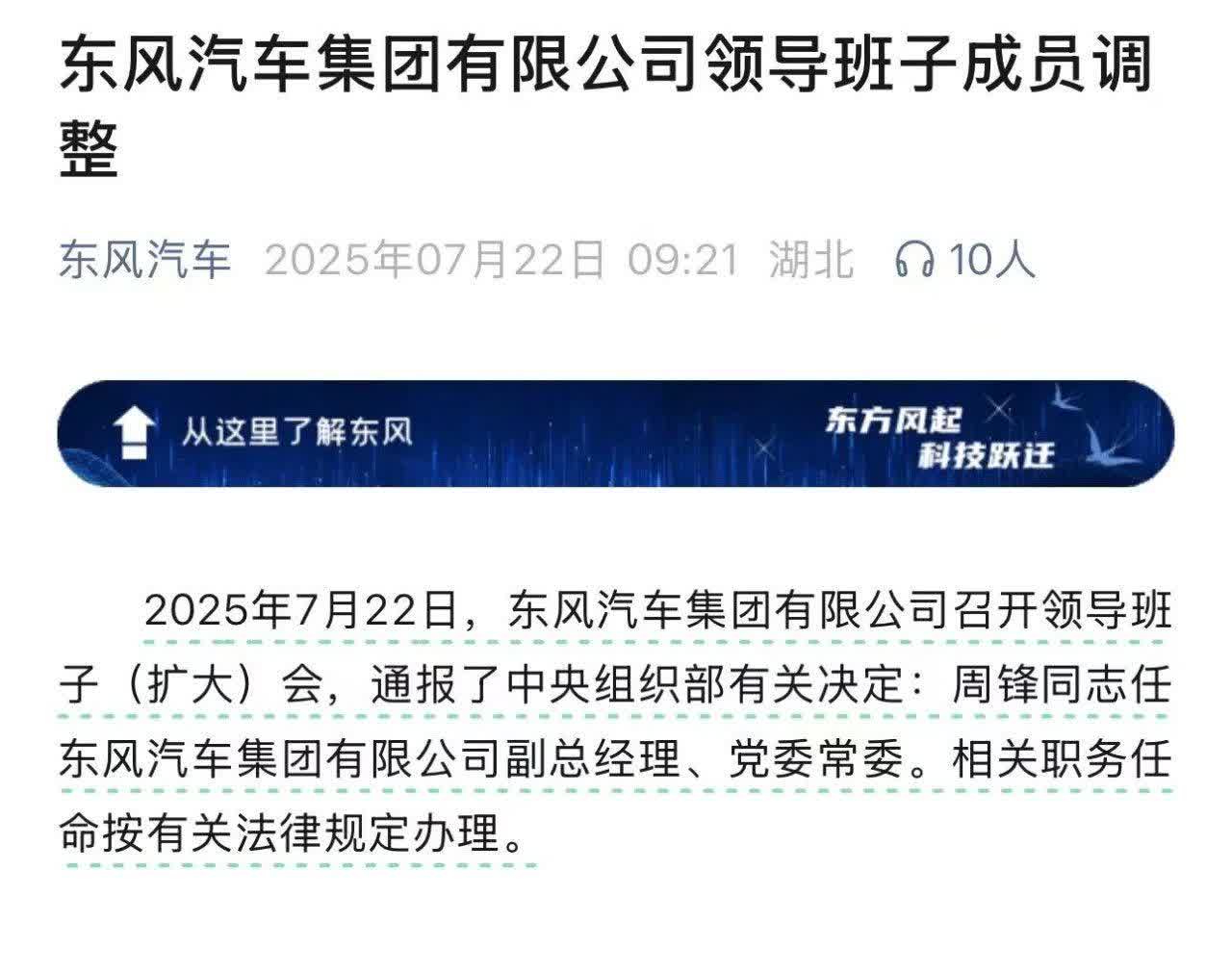 东风汽车人事调整!“准80后”周锋担任副总经理、党委常委 其有着21年东风履历