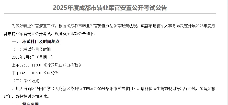 2025年度成都市转业军官安置考试公告发布啦!