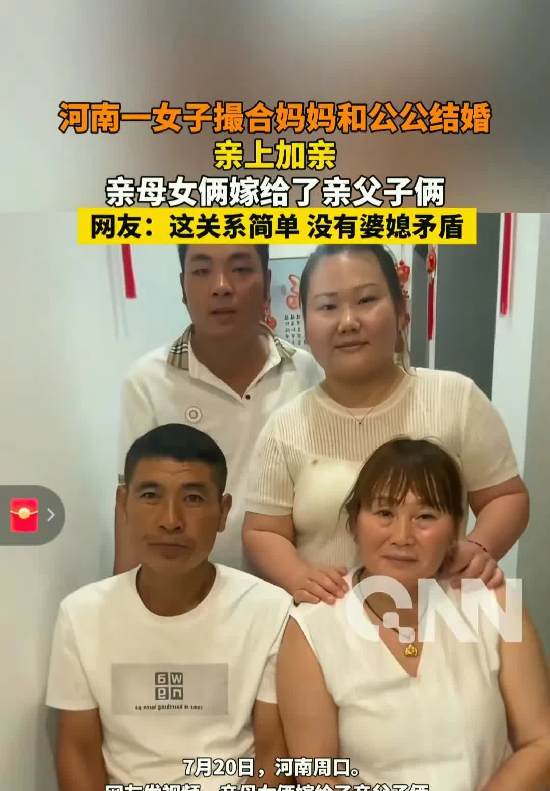 河南周口的女子小美,觉得公公太孤单了,就把自己母亲许配给公公,组成了一个新家庭。 小美和老公是父母再婚后的亲生儿女,女子的父母离婚已经十多年了,公公的妻子也是在好几十年前去世了,这么多年来,公公一直都是单身。 为了不让公公孤单,小美主动提出把自己母亲嫁给公公,两家人都没有反对,最终两人都得到了全家的支持,顺利成婚。 嫁女儿不用彩礼,娶儿媳妇也不用嫁妆,这样的家庭组合在农村是非常少见的,网友也是开玩笑说:关系简单,以后没有婆媳关系了。 但是也有网友说:这是什么伦理关系,太混乱了!其实不管是什么样的家庭组合,都没有彩礼、嫁妆和两头跑的辛苦。 只是将来孩子长大了,称呼长辈怎么称呼呢?大伙各执一词,有不同的看法和见解,其实都是正常的。