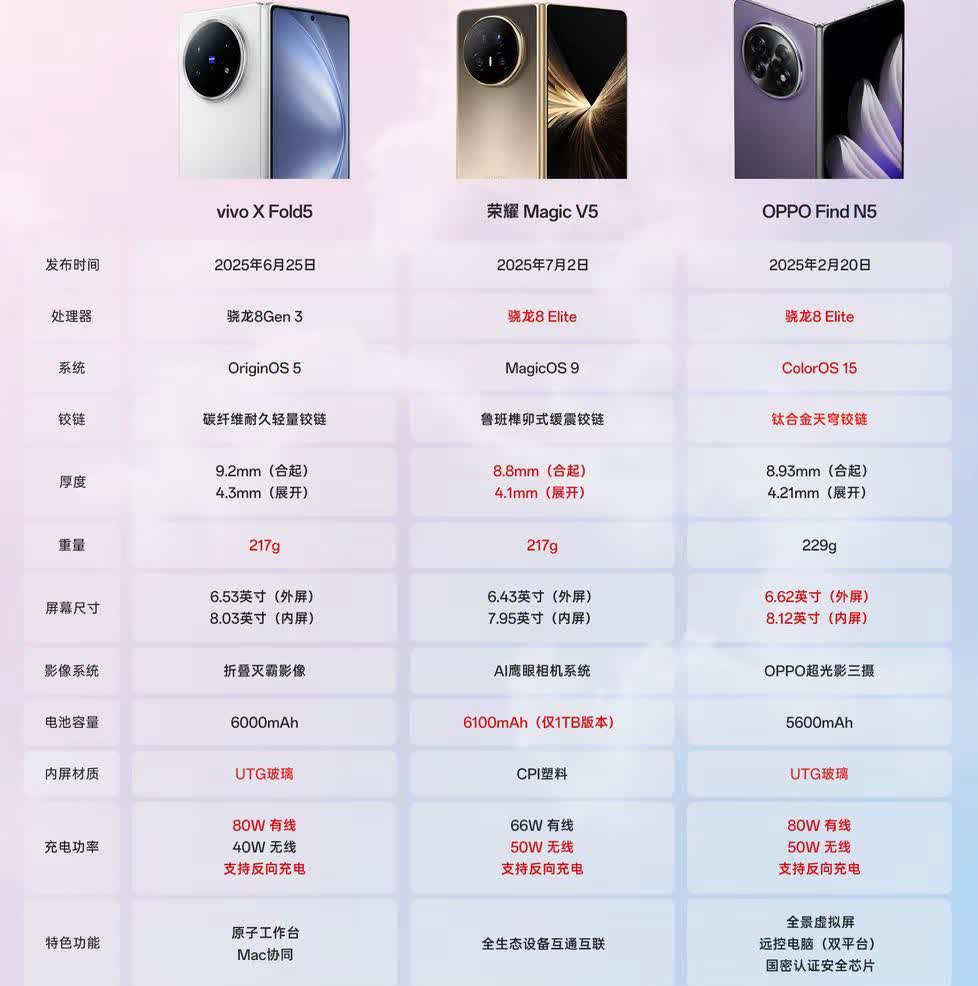 纠结折叠屏📱怎么挑?看完这篇再下单,保准不踩坑!⭐荣耀Magic V5:性能是绝对亮点,骁龙8至尊版加持,日常办公、多任务切换都能轻松拿捏。机身号称“全球最薄”,但之前有刷到买过的用户说凸起太大,不过手感方面还是因人而异🤔⭐vivo X Fold5:预算有限的话,它算很实在的选择😊。三款里价格最低,性价比拉满,但性能得提前有预期:骁龙8 Gen3是老款处理器,长时间的使用下运行速度会略逊于比其他两款较新的处理器。⭐OPPO Find N5:对比其他两款手感更为均衡,轻薄且镜头大小合适,在折痕控制和铰链强度上也比较出色😍。如果更看重办公体验,它搭配的骁龙8至尊处理器性能就很合适,再加上ColorOS系统的多任务分屏、跨设备协作等功能,日常用或轻度办公都能轻松hold住。最后给个明明白白的结论:追求“轻薄+性能”双极致,选荣耀Magic V5; 预算卡得紧,又想体验折叠屏,vivo X Fold5足够应付基础需求;想要性能在线、还看重系统实用性?OPPO Find N5的均衡表现大概率让你满意。按核心需求选,准没错😊