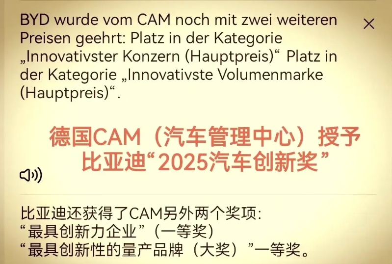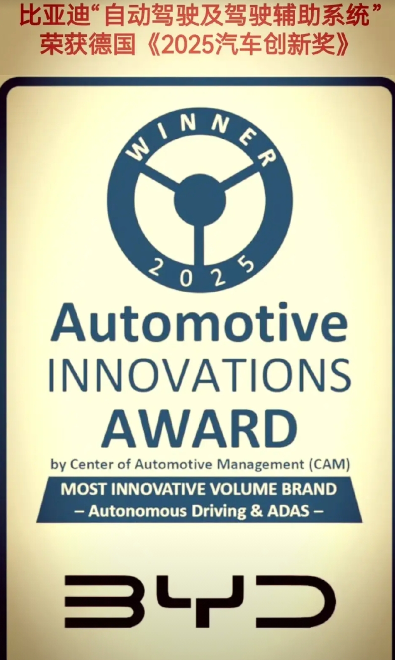 比亚迪又在德国获奖了。 这次是三个奖。 自动驾驶及其辅助系统拿了2025汽车创新