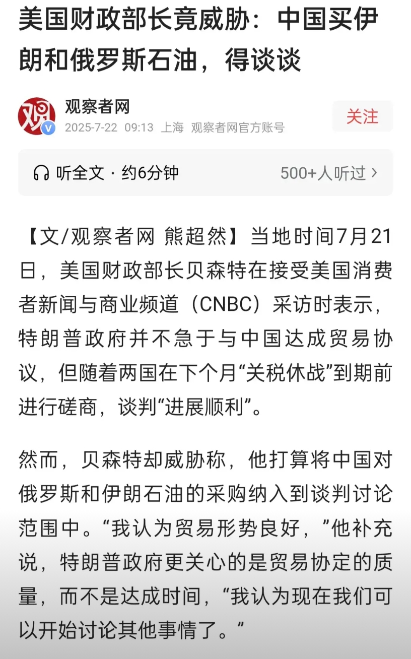 遭到东大多次无视,美财长终于坐不住,开始狗急跳墙,说出美国的真正目的了,不允许东大买俄罗斯石油,改买美国页岩油! 美国财长开始学金毛特那套凭空造牌的把戏,7月初高调对外放风,称中美计划在8月举行新一轮谈判,谈判议题从贸易领域扩展到其他领域,而且双方已经提前沟通谈判内容,进展顺利。 结果被东大多次打脸,东大暂无计划在八月份和美进行关税协议谈判。随着八月临近,美国期待的关税谈判,毫无进展,贝特森开始坐不了,昨天话风突转称:“特朗普政府并不急于与东大达成贸易协议,因为美国打算要求东大不得购买俄罗斯和伊朗石油的采购纳入到谈判讨论范围中,东大必须对此做出回应”。 不得不说,老美还是没有认清现实,不管美国如何出牌,手握王炸的东大,完全不需要理会,如果美国懂礼貌,东大大人有大量,会和其进行沟通。如果还是把自己当成“海贼王”,试图干涉东大能源采购政策,东大可能就不是连续三月不买美国页岩油,有可能会更长甚至永久,至于关税谈判和稀土出口管制,那更加别想谈了。