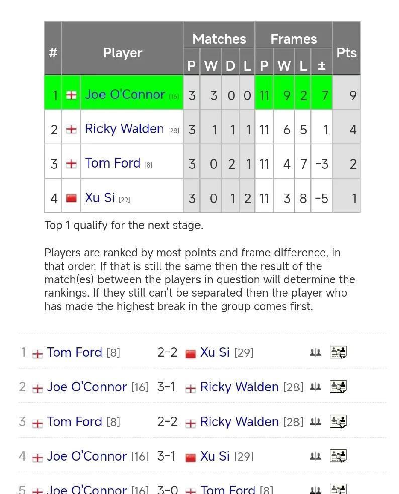 徐思、庞俊旭无缘决赛!斯蒂芬·马奎尔夺冠! 北京时间7月24日,斯诺克25/26赛季冠军联赛产生了决赛选手,乔奥康纳和斯蒂芬马奎尔携手晋级决赛。中国球员庞俊旭3-1战胜斯蒂芬·马奎尔,屈居小组第三,徐思以一平二负,位列小组第四。决赛采用五局三胜制,斯蒂芬·马奎尔3-1乔·奥康纳夺冠。