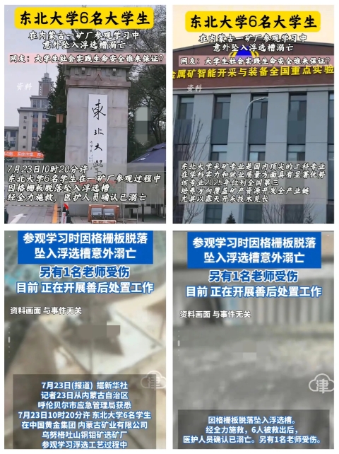 7月23日10时20分许,东北大学6名学生在中国黄金集团内蒙古矿业有限公司乌努格吐山铜钼矿选矿厂参观学习浮选工艺过程中,因格栅板脱落坠入浮选槽。事故造成6名学生溺亡,另有1名老师受伤。