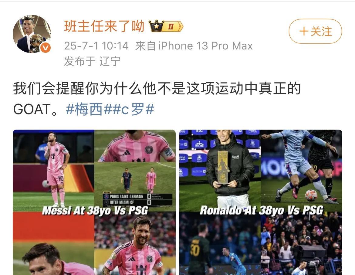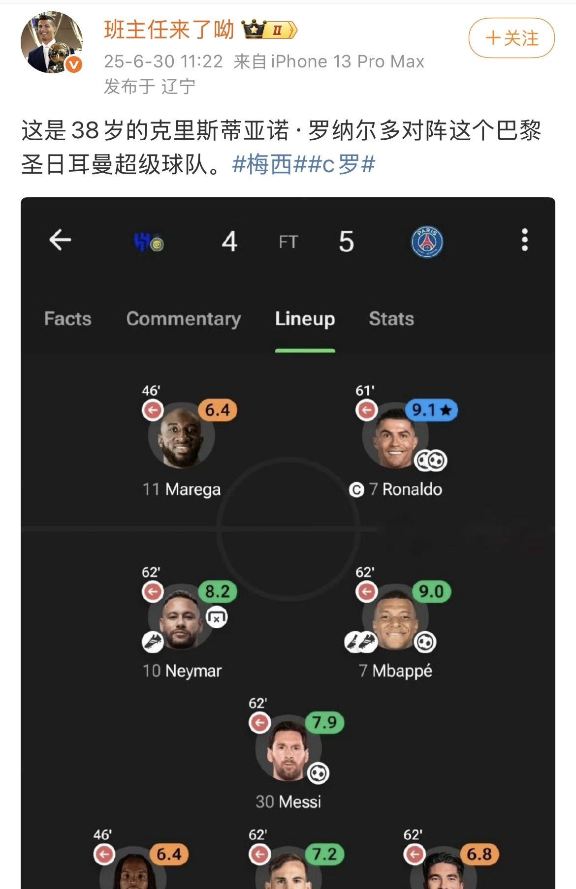 全明星表演赛,不参加就正赛禁赛一场,梅西也不去;参加了就正赛禁赛一场,C罗也要去。 2023年1月20日,梅西随巴黎队访问沙特,和利雅得全明星队进行了一场商业表演赛,对方阵容里就有C罗。巴黎5:4赢球。 这样的比赛,马马虎虎踢完,把钱挣了就过去了,谁不明白? 偏偏C罗粉丝当做宝,在世俱杯迈阿密国际输给巴黎后,他们翻出这场表演赛,吹捧主子“38岁时打入巴黎2球”,贬损梅西“38岁对巴黎颗粒无收”。