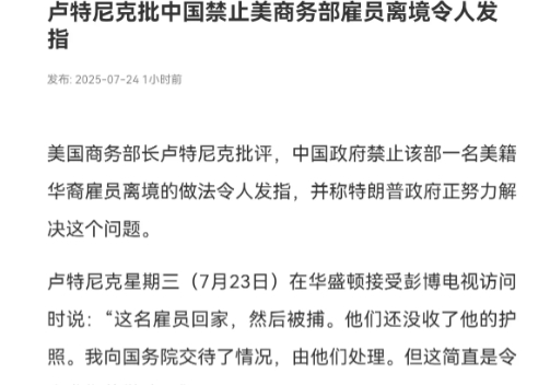 对中国的做法很愤怒,美国商务部长卢特尼克点名对我们进行批评!7月23日,美国商务部长卢特尼克声称,中国政府禁止该部一名美籍华裔雇员离境的做法令人发指,并称特朗普政府正努力解决这个问题。卢特尼克表示,这名雇员回家,然后被捕。他们还没收了他的护照。我向国务院交待了情况,由他们处理。