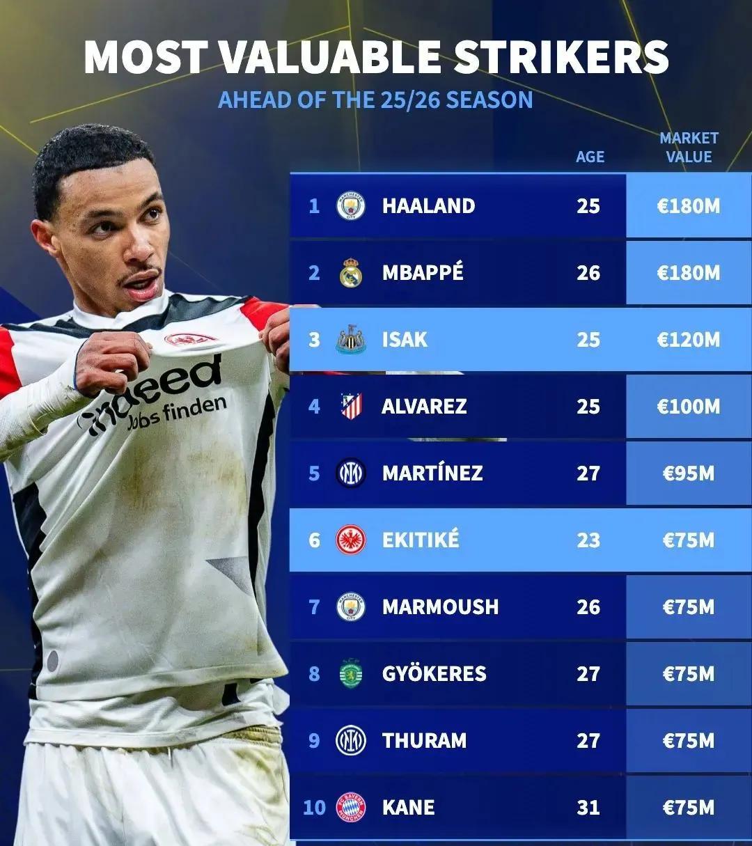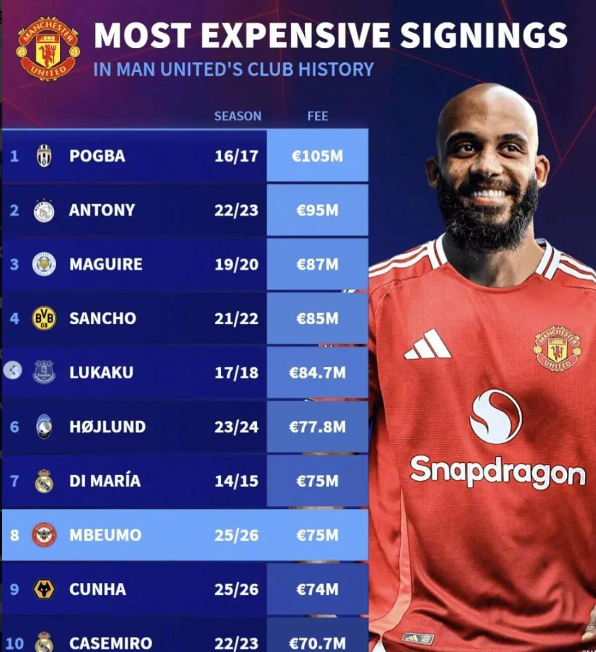 绿茵大数据! ★英超各队锋线三叉戟转会费排名! 其中曼联库尼亚+姆贝莫+霍伊伦德