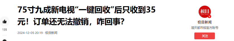 “强盗看了都甘拜下风!”吉林,一女子将九成新的75寸电视进行回收,当看到成交页面上的35元时,女子以为是验收费用,可没成想是平台的回收价格,女子无法接受,想要终止交易,但客服的回答却大跌眼界!网友:这哪是回收,简直就是明抢!   2024年12月,吉林一女子在网上吐槽,自己75寸九成新电视被以35元的价格回收了!她以为35元只是工作人员上门回收的评估费用,75寸的电视怎么说也得卖几百块吧?可没想到,订单没有办法撤销......   女子特别喜欢看电视,窝着沙发上买点零食,一边吃一边追剧,女子感觉非常爽,尤其是下班回家疲惫的时候,看会电视,就能缓解很多。周围朋友家的电视都放的灰都有好几层厚,但女子家的电视特别干净,天天开。   不过,女子对电视有一点不满就是,电视虽然大,也高清,但是不能语音控制,比如想把电视关了,还得走到电视身边关,非常不方便。现在的电视都出了新款,不仅画质好,音质好,还能用语音控制,想看什么剧直接对着遥控一说,电视就能切换。   于是女子想把自家的电视卖掉,再买一个新的电视。有了这个想法之后,女子先是在网上看了很多新款的电视,有不同的型号和牌子,她认准一款牌子后,就下单了。   然后开始在平台上看见有个“一键回收”的功能,女子想着这样怪方便的,自己不用将电视取下来,抬下楼找人回收,反而有专门回收的工作人员上门预估费用,还会再次报价,简直太省事了。   女子一直以为上门预估费用是35元,可没想到工作人员上门后,直接将女子家的75寸旧电视带走了,而收到钱不是大几百,却只有35元。   看到35元的时候,女子彻底傻了,没想到自家那么大的电视才价值35元?如果早知道35元的话,女子觉得自己就不会卖,新电视放在客厅,旧电视放在卧室,不香吗?   于是女子联系平台要求他们撤销这个单子,她不想卖了,因为价格太低了,一点都不划算,可是这个时候,不是女子想退就能退的,平台告诉女子这单已经完成了,不能撤销。   女子觉得自己被坑了,怎么都想不到电视会卖35元。她万万不能接受,将这个经历发布到网上,先是吐槽自己经历的这件事,其次就是希望广大网友们避雷,千万不要和自己一样被坑了。   网友们看后还劝女子放宽心,有35元都不错了,网友分享自家有台75寸液晶电视,找二手贩子来看,对方开价50,不是收到50,而是她要给人家50元,人家帮他处理掉!还有人说,自家有一台大两匹的格力空调,卖给收废品的400元。