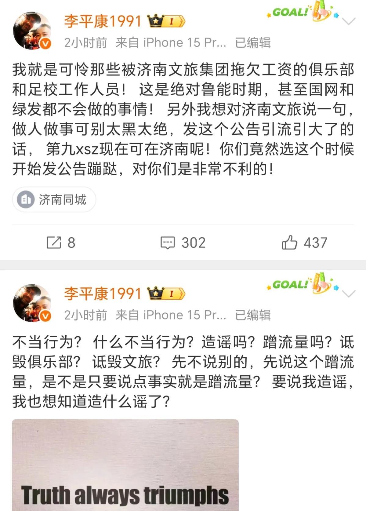 李平康回击泰山俱乐部:我就是可怜那些被济南文旅集团拖欠工资的俱乐部和足校工作人员