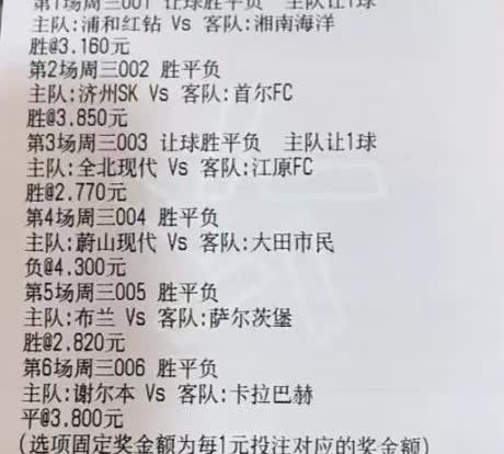 浦和红钻Vs湘南海洋,从历史交手记录来看,湘南海洋已经两杀浦和红钻,今日一战,到底是浦和红钻的复仇之战,还是湘南海洋三杀浦和红钻,下午18:30,咱们拭目以待。我个人选择了浦和红钻大比分复仇。 蔚山现代Vs大田市民,大田市民还是经常出大球,期待今天能踢出大球吧。 全北现代Vs江原FC,没敢碰大球,出来就认倒霉了,担心踢平或者是全北1-0,2-0江原。总的来场容错,期待好运