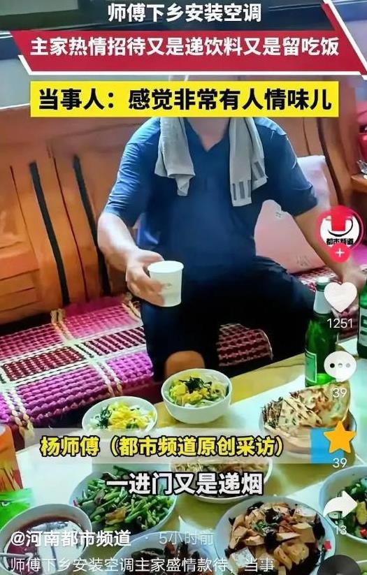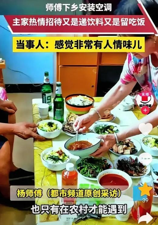 这就是乡下人的实在!陕西咸阳,男子下乡安空调,这一进门可把他整不会了。男主人还没等人坐稳,先塞了根烟,紧接着啤酒、功能饮料一股脑地摆上桌,架势比请亲戚还隆重。小哥埋头干活忙活了大半天,装好调试完毕正准备撤,女主人堵在门口,说在咱农村不吃饭谁都别想走。男主人也不甘示弱,直接一把拉进屋里,先灌一口啤酒再说 小哥推辞两句,人家还真有点急眼了,顺嘴就问是不是嫌自家菜不行。这下小哥彻底没法走,只能乖乖落座 女主人在厨房翻锅,男主人陪着唠嗑,一会儿的工夫,茶几上堆满了菜,什么鸡鸭鱼肉、地里摘的黄瓜西红柿,满满一桌,连饭带菜十几样 吃饭那会儿,男主人一边敬酒,一边说家常,女主人则忙着添饭加菜,两口子轮流上阵,气氛别提多热络了。小哥吃得都有点不好意思了,直说下次还来 临走时,女主人还特地给他装了满满一袋自家水果,连刚拆的烟也塞了几包,说啥都不让空手走。小哥心里是真感慨,城里头再热情的客户,大多也就是倒杯水顶多加个水果点心,很少能有乡下人这样,非得把你当家里人招待一通,真不怕麻烦 说实话,这种场面在农村并不少见。农村人的热情,有时候就是这么直接。他们讲究来者是客,讲人情、重面子,不怕多花点力气,也不怕麻烦自己,只要你进了门,就是自家人 其实,很多在外面跑业务的师傅都有体会,越是农村越有人情味,越让人觉得温暖。哪怕没什么山珍海味,也要让你吃得热乎乎、走得心里舒服,这种情义,是花多少钱都买不来的 现在城里人装修,业主能递瓶矿泉水都算客气。倒不是城里人冷漠,是钢筋水泥把人情都框住了。乡下不一样,谁家灶火冒烟都知道要留客,这种近乎执拗的热情,其实是庄稼人最朴素的价值观:你对我好一分,我就要还你十分
