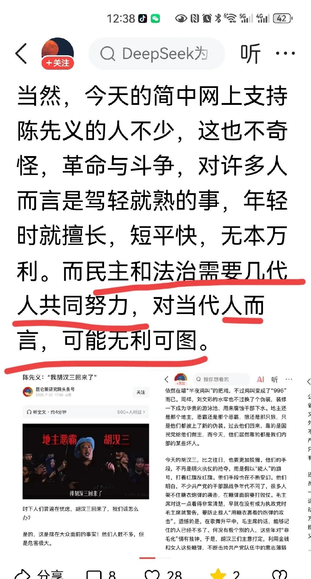 70多岁的陈先义先生,真的老了?温先生的解释是“毕竟退休了嘛”,他认为老陈可能并不知道自己的思想和认知能力已经退化和落后了…… 的确,老陈那篇《我胡汉三又回来了》,写得似曾相识,语言依然饱满革命激情,情境闪回大革命的代的腥风血雨…… 显然“落伍”了。 今日之社会,不搞阶级斗争,不谈继续革命了,他老先生为何又旧话重提呢?难道思想真的如温先生所言“停在”了那个时代?[大笑][大笑] 医学证明,随着年龄增长,身体机能包括大脑功能会逐渐衰退,75岁人群大脑神经细胞减少、脑血流量下降,可能影响认知,出现记忆力减退、注意力不集中、语言表达困难等认知退化表现。 不过,若老人日常注重锻炼大脑、有健康生活方式,认知功能可能保持良好。比如经常读书看报、下棋打牌、社交活动等可促进大脑活跃,充足睡眠、均衡饮食、适度运动等利于维持大脑功能。 一个军人,一个作家,一个读书不止,笔耕不辍的人,认知会退化? 温先生的“不想苛责”和“时代局限性”理论,有只自作多情了吧?[笑哭][笑哭]