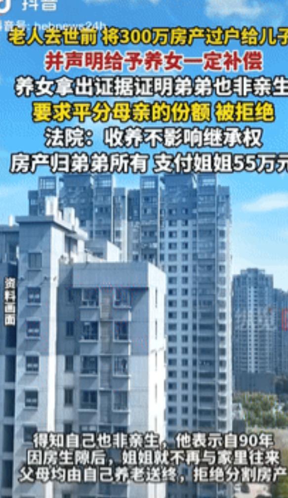 “都是钱惹的祸!”天津一老人去世前,把价值300万元的房产过户给儿子,并声明会给养女一定补偿,不料,养女执意要平分房子,两人争执不下,闹上了法庭,结果养女拿出证据,证明弟弟也不是亲生的,法院判了! 天津有这么一家子,因为一套房子把几十年的情分都闹到了法院,说起来这事儿挺曲折,最后还揭出个藏了大半辈子的秘密,谁听了都得唏嘘半天。 事儿得从老两口说起,上世纪六十年代,他们收养了个 8 岁的小姑娘,过了七年又添了个 “儿子”,凑成了旁人眼里的 “好” 字。 那时候日子过得简单,老两口把俩孩子当亲生的疼,吃的穿的从没偏过谁,就盼着姐弟俩以后能互相帮衬跟亲的一样亲。 谁也没想到这份和睦在 2007 年被一套房子搅乱了,那年家里赶上拆迁,分了套市价 300 万的房子。,琢磨着儿子以后过日子得有个窝,就想把房子给儿子,还特意去做了公证。 只是当时签赠与合同的时候,只有老爷子一个人的名字,没让老伴儿签字,那会儿谁也没当回事,可这偏偏成了后来的祸根。 打这以后养女心里就有了疙瘩,大概是觉得房子没自己的份,跟家里的关系一下子就远了,后来哪怕住一栋楼,楼上楼下也跟陌生人似的,好几年都不怎么说话,老两口心里不是滋味,可话赶话到了那份上也没辙。 又过了些年老太太先走了,老爷子身体一年不如一年,端茶倒水、伺候病床,全靠儿子里外忙活,听说那养女三十多年没怎么来看过老两口,更别说跟前尽孝了,可老爷子到了弥留之际,心里最放不下的还是这个疏远的闺女。 去世前老爷子把房子正式过到了儿子名下,还特意留了句话:“闺女是收养的,可我们从没拿她当外人,这些年因为房子闹僵了,来往少了,但我们老了是儿子伺候的房子就给他,不过儿子啊,你得给你姐点补偿,你们还得像亲姐弟一样处。” 那纸上 “像亲姐弟一样” 几个字被红笔圈了又圈,看着都让人心里发酸。 可谁能想到老爷子刚走,养女就把弟弟告到了法院,说要平分这套房子,她的理儿也简单,房子是老两口共有的,当初赠与合同没老太太签字,那老太太的一半就得算遗产,自己作为女儿有权分一份。 弟弟哪儿能接受啊?这些年伺候老的,端屎端尿都是自己一个人,姐姐连面都少见,现在跑来要分房子,换谁都得憋屈,俩人吵得不可开交,谁也不让谁最后只能让法院来断。 法庭上更让人吃惊的事儿来了,养女那边拿出个证据,户口本复印件,上面明明白白写着,弟弟跟她一样,也是当年抱来的。 这话一出来弟弟当场就愣那儿了,活了几十年,一直以为自己是家里的亲儿子,这下突然说不是,心里那道坎儿哪儿那么好过?更讽刺的是老爷子临终前念叨的 “像亲姐弟一样”,到头来竟是这么个 “一样” 法。 法官看着这特殊的一家子,调调解解了三个钟头。最后俩人总算达成了协议,房子归弟弟他得给姐姐 55 万补偿,剩下的丧葬费、抚恤金扣了开销俩人平分。 说起来法院这么判,也算两边都顾到了,既认了弟弟这些年伺候老人的辛苦,也没亏了姐姐作为继承人的份儿。 可话又说回来,法律上的账算清了,家里的情分呢?养了大半辈子的恩,几十年的姐弟情,最后得靠一张判决书来定输赢,想想都觉得不是滋味。 (信息来源:纵览新闻 2025年7月21日)