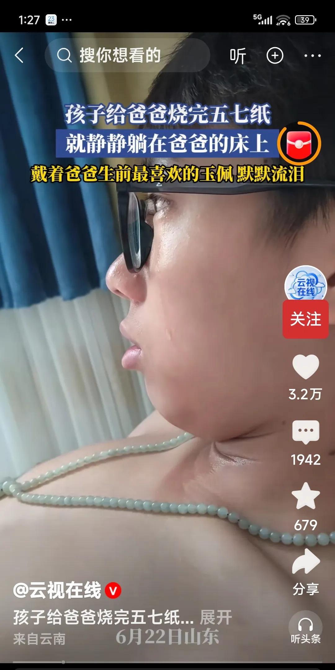 孩子给爸爸烧完五七纸,就静静的躺在爸爸的床上,带着爸爸生前最喜欢的玉器,默默流泪。网友说:男人的成长:崇拜父亲,质疑父亲,对抗父亲。成为父亲,理解父亲,不如父亲,最后怀念父亲。有的人说:我爸爸走的时候我才8岁,我没哭!我30岁那年过年给他上坟。告诉他我当爸爸了,那一刻我嚎啕大哭,思念的回旋镖20年后打中我的眉心,那一刻我才明白……。有的人说:我不敢死父母70多,孩子还不能自立。老天让我再多赚点钱吧,80后中年人太不容易了。大家说是这样的吗?