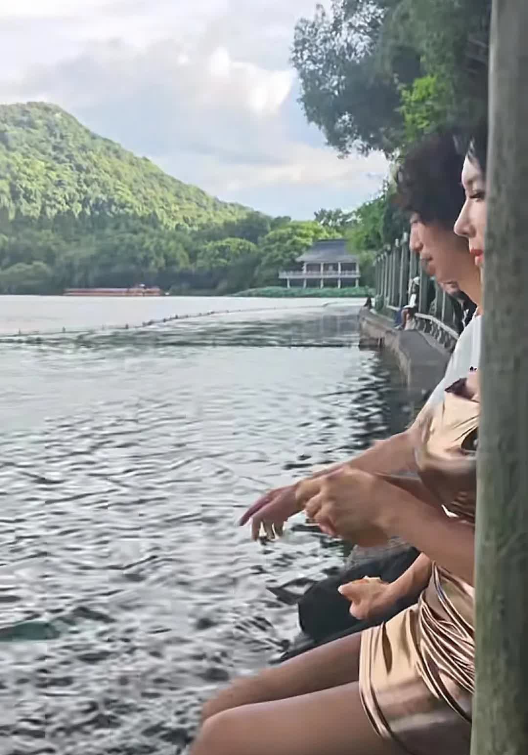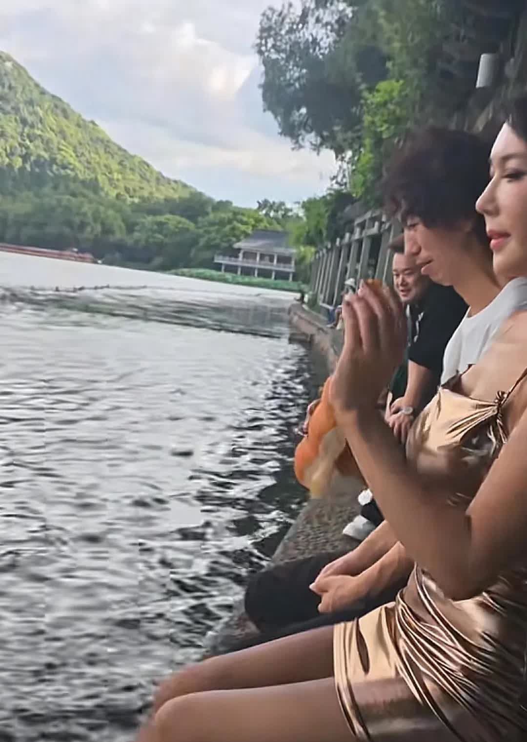 龚玥菲庞麦郎后续,俩人坐在西湖边喂鱼。主要是龚玥菲拿着面包在喂,庞麦郎则坐在旁边
