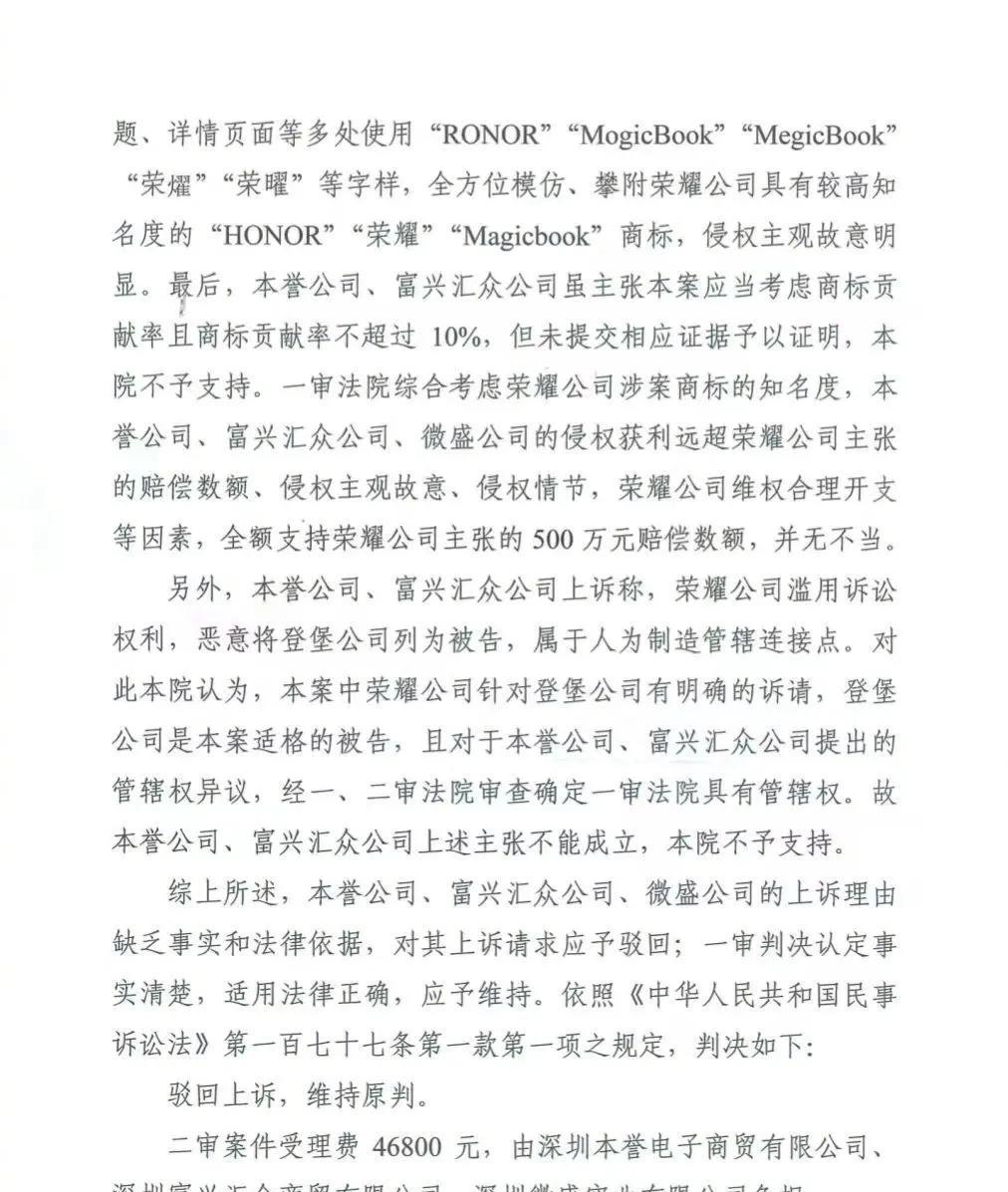 500万赔偿!二审上诉驳回!荣耀法务终于又一次硬气了一回!从之前的抹黑荣耀,到这一次的商标侵权,荣耀上诉的证据确凿。如果说之前的抹黑是个人行为,那么这一次被告的商标侵权就是赤裸裸的商业行为了,有RONOR、MogicBook等商标的侵权,对方根本就无法狡辩!说实话,对于这种行为,荣耀只诉求500万真的是不算高了,至少也应该千万起步!国产品牌的产品力和品牌影响力在不断的提升,这些品牌“蛀虫”在背后搞鬼做李鬼,不罚你罚谁? #三家公司侵权荣耀终审被判赔500万元#
