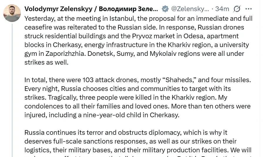 2025年7月24日(今日15:30)乌克兰总统泽连斯基在个人社交媒体上说:昨天,在土耳其伊斯坦布尔的会议上,向俄方重申了立即全面停火的建议。 作为回应,俄罗斯无人机袭击了敖德萨的住宅楼和普里沃兹市场、切尔卡瑟的公寓楼、哈尔科夫地区的能源基础设施以及扎波罗热的一所大学体育馆。顿涅茨克、苏梅和尼古拉耶夫地区也都受到袭击。总共有 103 架攻击无人机和 4 枚导弹。 每天晚上,俄罗斯都会选择城市和社区作为打击目标。不幸的是,哈尔科夫地区有3人丧生。我向他们所有的家人和亲人表示哀悼。另有10多人受伤,其中包括切尔卡瑟的一名 9 岁儿童。 俄罗斯继续开展恐怖活动并阻碍外交。作为回应,我们对他们的后勤、军事基地和军事生产设施的打击。 我们将尽一切努力确保外交发挥作用。但必须结束这场战争的是俄罗斯——它自己发起的战争。 要点解析: 1早前22日,记者采访了俄罗斯总统新闻秘书佩斯科夫,俄罗斯对在土耳其开展的第三次会谈不抱有任何幻想,而且他们预想不可能有实质性的结果。 佩斯科夫说:没有理由期待任何奇迹式的突破,在目前的形势下,这几乎是不可能的。 从俄罗斯的战场的反应来看,俄罗斯坚守自己的战争目标,这个目标也是战争一开始就设定的:划转领土,解除武装,不能加入北约。 2.泽连斯基希望尽快与俄罗斯总统普京见面谈判,土耳其也希望能有这样的好结果,但是,俄罗斯认为见面的过程还很漫长。显然,乌克兰仍然坚守无条件停火,俄罗斯仍然坚守有条件停火,因此,注定第三轮和平谈判成果不太多!