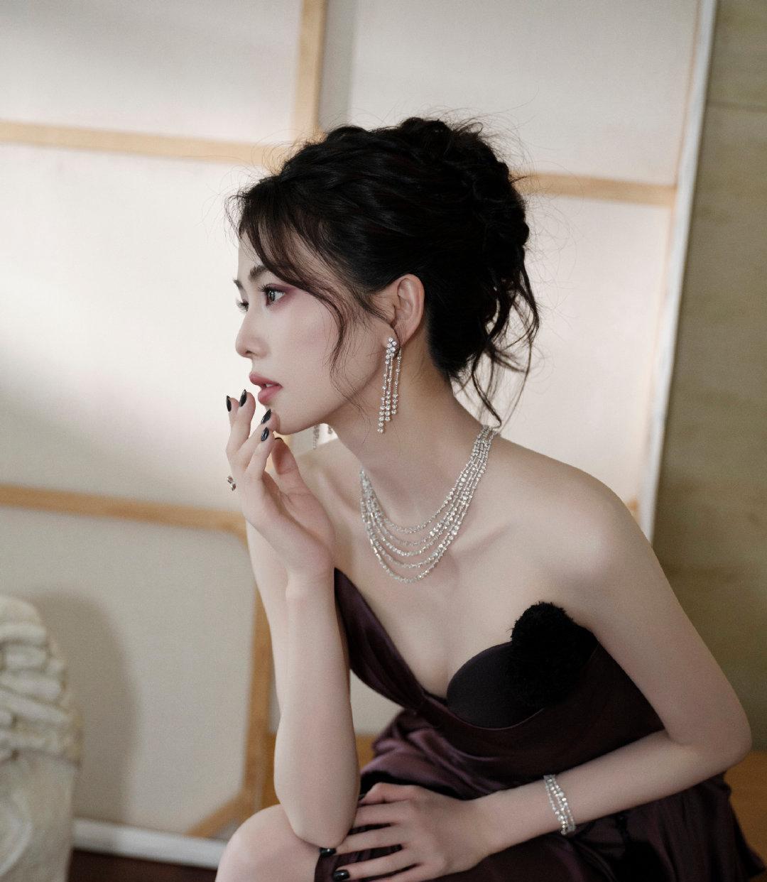 白鹿身着UlyanaSergeenko2025春夏系列紫色抹胸高定裙,搭配D