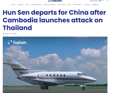 泰国国家报(The Nation Thailand)今天(24日)对外披露消息称,“柬埔寨军队袭击泰国后,柬埔寨前首相洪森乘坐私人飞机从金边出发前往中国”。目前,该信息尚未得到柬埔寨当局官方证实。