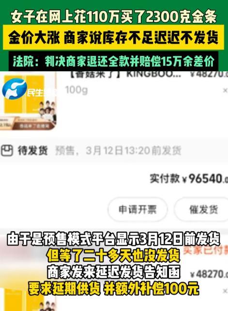 北京女子趁着金价形势大好,在网上花110万买了2300克金条。却不料,商家眼红金价涨太快竟拒绝发货。女子说原本想趁着这个机会理财,却因为商家玩不起,让她每天亏钱。商家:“我们愿意承担违约责任,但货是发不了!”法院这么判了。 据大参考2024年12月20日报道,在北京打拼多年的乐女士,一直挺看重理财的,平时就爱研究市场行情。 2024年年初,她盯上了黄金,眼看金价一路上涨,她觉得机会来了,打算“抄个底”。 她在某大电商平台的直播间,看中了某商家推出的金条——每克478元,比市场价略低些。 乐女士不敢一次下太大单,就分几次下了共计2300克,总共花了大概110万。 她当时可高兴了,想着这要是金价再涨点,利润就来了。 商家当时也拍胸脯承诺,说三天内发货。 可三天过去了,什么动静也没有。乐女士主动联系平台客服,对方说订单太多,发货会稍晚,让她再耐心等等。 她一开始也没多想,就继续等。但没想到,接下来一连串操作让她彻底崩了。 等到金价冲破500元/克后,商家突然告诉她:“不好意思,库存不够,发不了货了。只能延期,另外补偿100块。” 乐女士听完当场就炸了:“这不就是看金价涨了不想卖了吗?我当初就是冲着价格低才买的! 现在你让我退款,涨上去的那几十块一克怎么算?我这几天天天看金价都憋屈,真的是在‘活亏’!” 她一遍遍找商家沟通,对方死活不同意发货。赔偿也只肯给那象征性的一百块。 这事儿要搁一般人,可能就认栽了。 但乐女士没忍,她直接把商家告上法庭,要求对方履行合同、赔偿损失。 在庭上,乐女士坚持认为:下单那一刻合同就成立了,你收了钱就该按约定发货。商家不能因为金价涨了就赖账,这不是明摆着耍无赖吗? 而商家那边则说:最近金价涨得太猛,成本大幅飙升,确实调不到货,不是有意违约,只能承担一点责任,但发货真的做不到了。 法院审理后认为:合同已经生效,商家不能因为行情变了就不履行承诺,这属于违约。 最后判决是:合同解除,商家退回货款109.94万元,并额外赔偿乐女士因金价上涨带来的差价损失——共计15.64万元。 商家不服,上诉。但二审法院维持了原判。 整件事从下单到判决,持续了几个月,乐女士终于拿回了属于自己的钱,也算是扳回一局。 信源:大参考