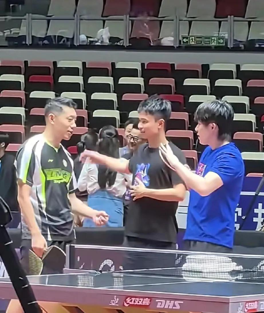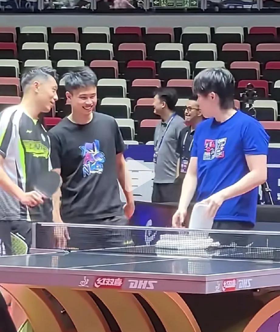 两个黄金左手之间的交流 乒超联赛训练场很欢乐, 哈哈全面老熟人大型见面会, 昕哥,头哥还有7号愉快交流, 两个黄金左手天才同框了, 昕哥这发型新换的吧, 头哥在昕哥面前就像个可爱的孩子。 全网都在蛐蛐头哥的蓝色文化衫, 头哥穿着有点小了 魏桥那么多文化衫, 不是非穿不可, 算了懂得都懂[捂脸]