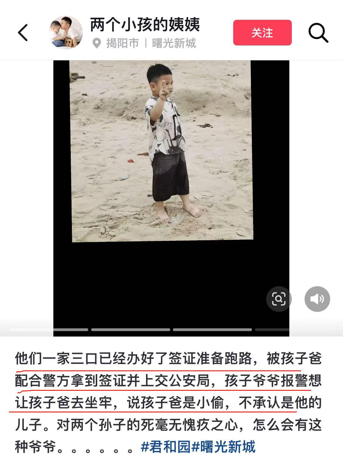 6月11日,孩子姨姨发文称,爷爷一家三口办好了签证准备跑路,被孩子爸爸配合警察扣下。爷爷竟想报警抓孩子爸爸,说他是小偷。由此可见,爷爷对两个孙子和这个大儿子毫无心疼之意,心里只有小媳妇和小儿子,这样的爷爷不要也罢。