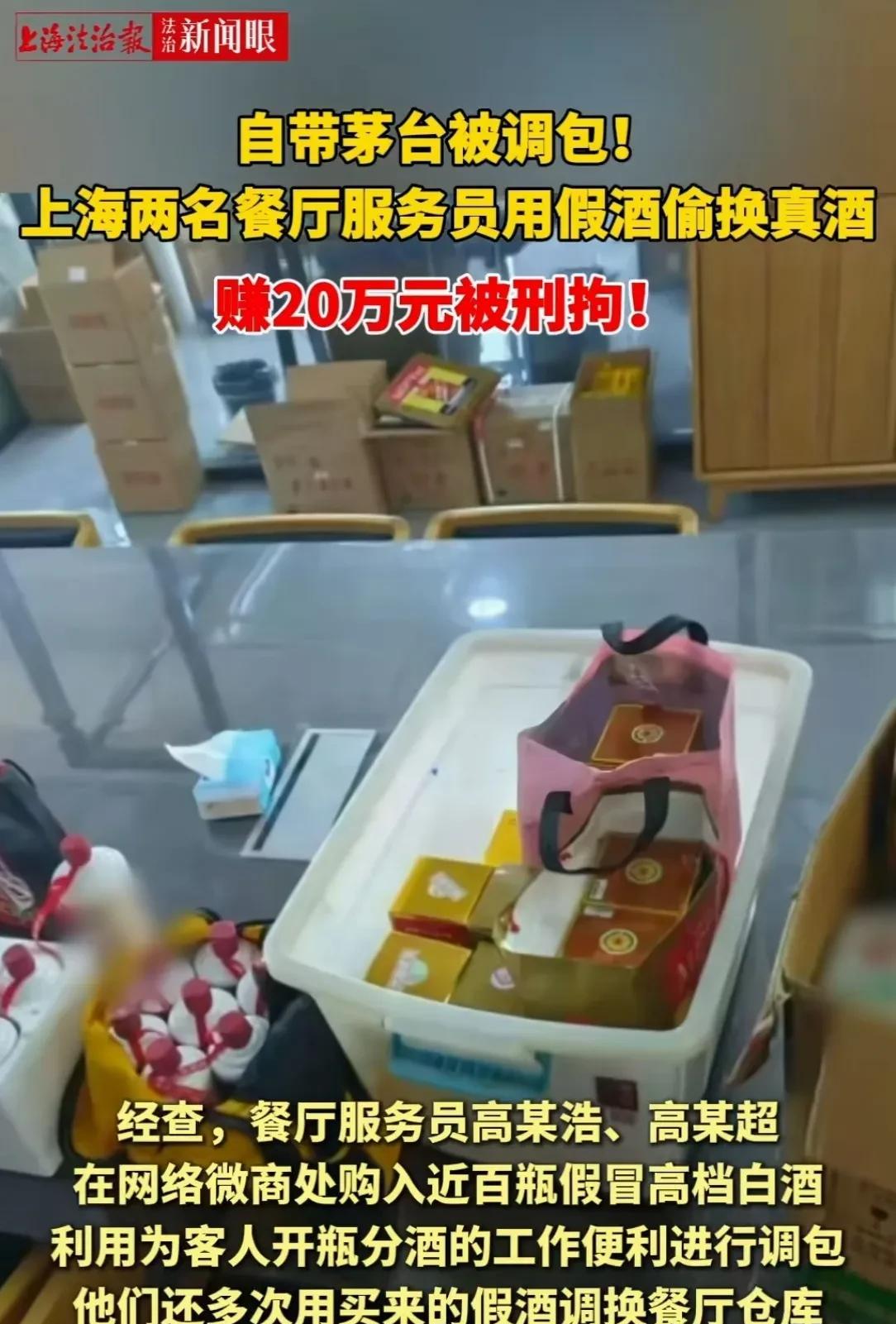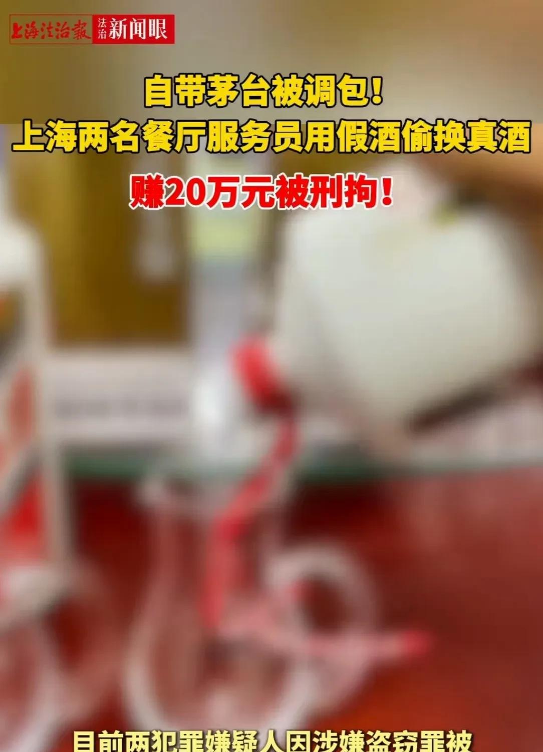 上海,男子去餐厅吃饭,自带了一瓶茅台酒,饮用后觉得口感不对,以为是存放导致白酒变质。几天后男子又来吃饭,这次他新买了一瓶茅台,结果又出现同样问题。男子拿出提前拍下的酒瓶喷码,和桌上的这瓶对比,发现两次都被调包,男子立马报警。警方介入后,两名餐厅服务员很快承认了,警方一查,发现俩服务员,不止调包客人高档白酒这么简单! 7月24日,上海法制报报道,张先生带了一瓶茅台白酒,去某餐厅请客。 服务员主动帮忙开酒,饮用时,张先生发现酒的口感异样。 第二次,张先生新买了一瓶茅台,提前拍下了酒瓶上的喷码,两个一对比,发现了服务员主动帮忙开酒的秘密。 张先生要请一位朋友吃饭,顺手在家里拿了瓶茅台。 张先生是这家餐厅的常客,他一直对这家的菜品,情有独钟。 两人点了几个小菜,等菜上来了,张先生拿出那瓶白酒,这瓶酒是他收藏的,年份比较长。 都知道白酒放的时间越长,味道越淳,他专门邀请朋友一起品尝。 张先生刚想开启酒瓶,一位年轻的男服务员凑过来:先生,我来帮你打开吧,说着就拿起了那瓶酒。 本以为餐厅有这项服务的,毕竟这儿的消费水平也不低。 服务员拿着那瓶酒,走到房间角落的橱柜那里,开启了瓶盖,又把酒送回来,还很专业的给两人满上酒。 两个朋友好久不见,面对美味佳肴,准备来个一醉方休。 可连续两杯酒下去,张先生皱起了眉头。 我怎么喝着这酒不是那个味了呢?张先生说。 朋友也说:和之前喝的那些,确实口感不同。 两人拿过酒瓶,仔细查看,并没有看出有啥不一样。 张先生家,同一批号的这种酒有多瓶,他们之前喝的也是这种酒,啥口感,一品就知道。 张先生认为,这瓶白酒从他拿出来,到服务员开瓶,并没有离开这个房间。 所以并没有多想,以为是存放的时间长酒变质了。 他把这瓶酒放到一边,又在餐厅买了其他牌子的酒,事情就这么过去了。 张先生回到家,把家里的酒挨哥看了一遍,却越想越不对劲。 这些同品牌的酒,为啥偏偏就那瓶出了问题? 张先生突然有了个想法,他也是见过世面的人,对某些事看的门清。 几天后,张先生再次去那家餐厅吃饭,这次他新买了一瓶茅台,提前把酒瓶的喷码用手机拍了下来。 他不露声色,还是照常点了几个菜,招呼服务员帮忙开瓶。 这次是另一个男服务员过来,和上次一样,他把酒拿到柜子那里,背对着顾客操作,然后拿回来。 张先生端着酒杯细品,果然又发现和上次同样的事,这酒根本不是茅台的那个味。 他打开手机,对照瓶子上的喷码,果然猫腻就在这里,两个码不同! 张先生明白了,这明摆着,酒是被人掉包了! 连同上次,光是自己就连着碰上了两次,这家餐厅的问题可真不小。 他家是高档餐厅,来这里吃饭的客人,自带的酒,大多是高端白酒,照这么个干法,这餐厅的事大了去了! 气愤的张先生马上报警,民警介入后,展开调查。 餐厅的两名服务员大高、小高两人就承认了,他们经常调包客人高档白酒的事。 原来,两人在餐厅当服务员,时间一长他们发现,常有客人自带高档白酒来吃饭,两人就耍起了小聪明。 他们在网上买了100多瓶,假冒的高档品牌白酒。 利用主动为客人开瓶分酒的机会,调包客人自带的白酒,偷偷藏起来找机会卖掉。 别看两人作案时胆大心细,见了民警早就怂了,很快又供出了另外的案件。 他们多次用假酒,调换餐厅仓库的真酒,再高价卖掉,时间不长,就赚了约20万! 俗话说,不怕贼偷,就怕贼惦记,餐厅怎么也没想到,自家的服务员,竟是两只硕鼠。 这样的事还真不少,有人爆料,他们家在酒店请客,带了一箱飞天,结果整箱被服务员调包。 席间有客人当场指出酒有问题,还以为是卖酒的搞鬼,结果商家做了记号,报警一查,酒店4个服务员承认是联合作案。 正是巨大的利益空间,使这些年轻的服务员挺而走险,结果反毁了自己的前程。 那么,从法律的角度如何看待这事呢? 《刑法》第264条:盗窃公私财物,数额较大的,或者多次盗窃、入户盗窃、携带凶器盗窃、扒窃的,处3年以下有期徒刑、拘役或者管制,并处或者单处罚金; 数额巨大或者有其他严重情节的,处3年以上10年以下有期徒刑,并处罚金。 服务员利用职务便利,秘密用假酒调换客人自带的真酒,属于以非法占有为目的,秘密窃取他人财物,符合盗窃罪构成要件。 两服务员累计获利约20万元,已达到数额巨大标准,可面临3-10年有期徒刑。 《刑法》第266条:诈骗公私财物,数额较大的,处3年以下有期徒刑、拘役或者管制,并处或者单处罚金;数额巨大或者有其他严重情节的,处3年以上10年以下有期徒刑,并处罚金。 诈骗罪与盗窃罪的竞合: 服务员既盗窃真酒又销售假酒,同时触犯盗窃罪和诈骗罪,需数罪并罚,一错再错,罪加一等。 该案警示:任何非法侵占他人财物的行为,终将受到法律制裁。 对此你怎么看?