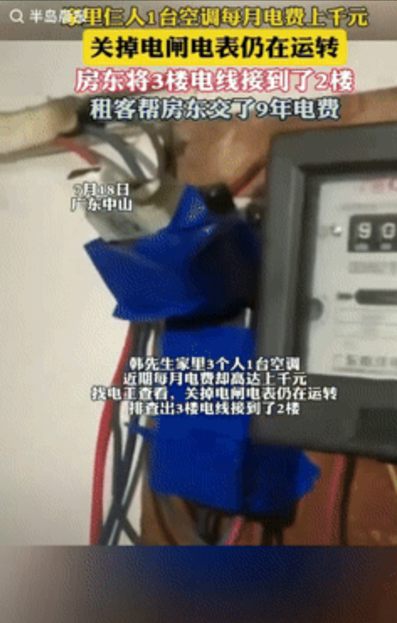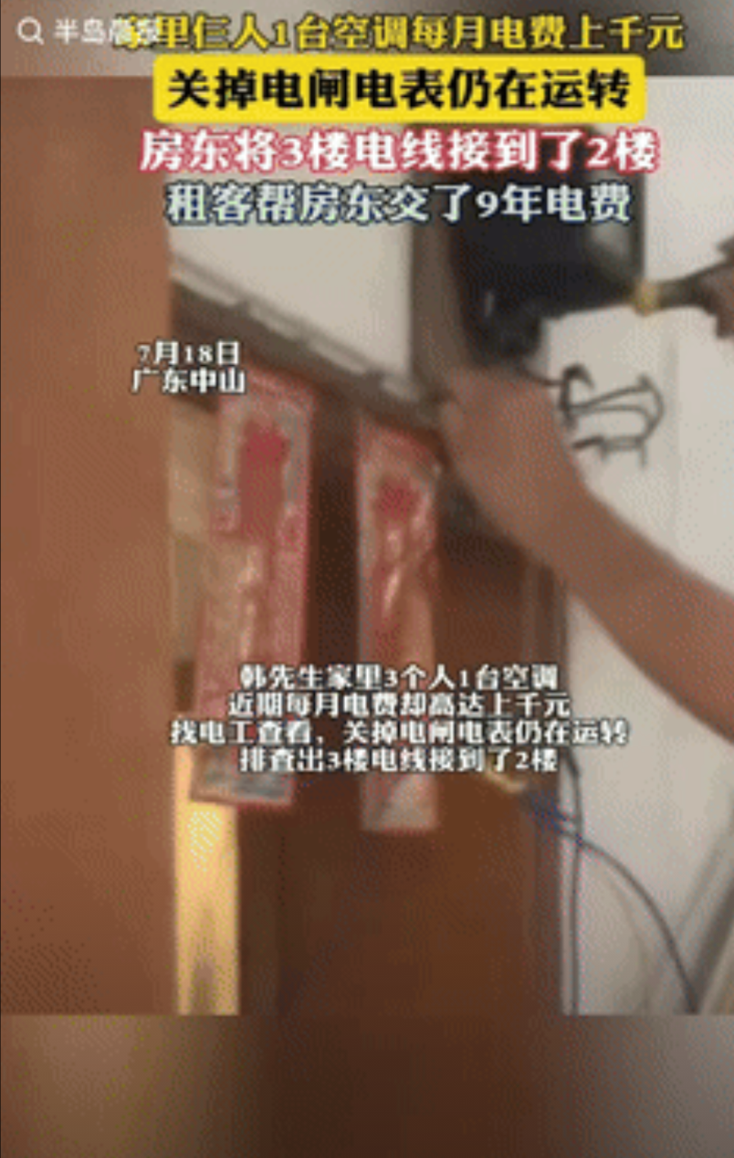 “妥妥大冤种!”广东中山,一家三口共用一台空调,可每月电费却高达上千元,男子找电工排查,谁料,关掉电闸后,电表依旧在运转,电工排查出3楼电线,接到了男子家,而3楼住户的身份,让男子很是意外,网友:城府太深了! 据半岛晨报7月23日报道,事情发生在中山,男子交电费时,发现金额和他家用电量对不上,夏天最费电的就是空调,他们虽然是3个人租房子住,但每天只开1台。 出门在外能省则省,但电费远远超出他的想象,其实这种现象已经维持很长一段时间,可男子始终没当回事,就算不是民水民电,以他们的用电量根本达不到这么多。 为解开心中的疑问,男子花钱请了名电工,结果就发现了其中的猫腻,男子直接找到3楼住户,没想到这里住的人竟是房东一家,他们在男子还没租房子前,就把电线接到了楼下。 这么多年都平安无事,房东也是心存侥幸,没想到男子竟会去查电闸,男子住了9年,这就意味着他帮房东交了9年电费,完全就是大冤种。 房东原本还想挣扎一番,但男子根本不给他机会,直接报警,有电工这个证人,再加上线明摆着在他家电表上,房东无论怎么说,都没法抵赖。 在铁证面前,房东只好承认错位,为补偿男子,他决定归还男子15000余元,遇到这种房东,趁早搬出去,心眼实在太多了。 对于这件事情,大家有什么看法?