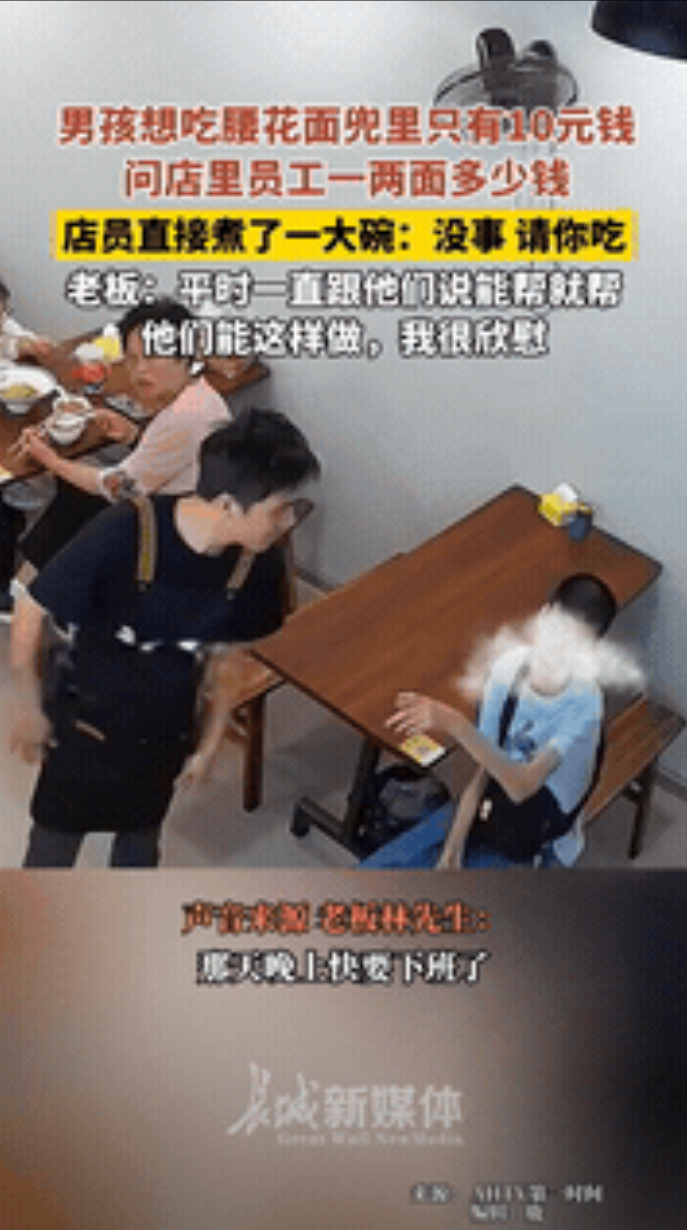 “太感动了!”四川成都,一个瘦小的男孩怯生生地走进面馆,小心翼翼地问:“叔叔,我想要一两腰花面…可只有10块钱,够吗?” 岂料,店员一句斩钉截铁的“不用!请你吃!”,转身就端上来的不仅是一大碗热腾腾的腰花面,还加了份甜点。更暖心的是,老板知道后非但没怪罪,反而欣慰地夸员工做得对!网友:“活该这样的老板发财啊!” 据长城新媒体7月23日报道:成都一家快要关门的面馆里,来了个背着书包的小男孩。 孩子看着瘦瘦的,说话声音也不大,他问店里的人:“叔叔,一两腰花面得多少钱?我……我兜里只有十块钱,够吗?”他可能担心钱不够,声音带着点犹豫。 没想到,店里干活的人一听,想都没想就说:“不用花钱,叔叔请你吃!”说完这话,那人扭头就去灶台忙活了。 没过多久,孩子面前就摆上了满满一大碗香喷喷的腰花面,碗旁边还放了份小甜品。 小男孩捧着热乎乎的面碗,一个劲儿地说谢谢,这事儿后来传到了面馆老板林先生耳朵里。 林老板一点没怪员工擅自做主,反而觉得挺欣慰。他说平时就跟伙计们念叨过,碰上看着不容易的人来吃饭,能帮一把就帮一把,该免单就免单,这次员工这么做了,他觉得挺欣慰的。 这事儿在网上传开,看的人心里都暖暖的。有人夸店员那句“请你吃”说得干脆:“就冲这毫不犹豫的劲儿,这店活该生意好!帮人,有时候就是想帮就去做了,没那么多弯弯绕绕。” 也有人觉得老板的态度更难得:“老板没心疼那碗面钱,还夸员工,说明人家店里从上到下心肠都好。不是装样子,是真把帮助人当事儿做了。” 一碗面看着普通,可对一个可能饿着肚子、小心翼翼的孩子来说,那就是天大的温暖。 店员那句爽快的答应,老板那份真诚的赞许,都没什么惊天动地,就是普通人遇上事儿时,自然流露的一份将心比心。 生活里,正是这点点滴滴不掺假的善意,让人觉得日子有奔头,人心有温度。 您说,是这个理儿吗?您碰上过这样让人心头一热的实在事儿没?在评论区谈谈您的经历。