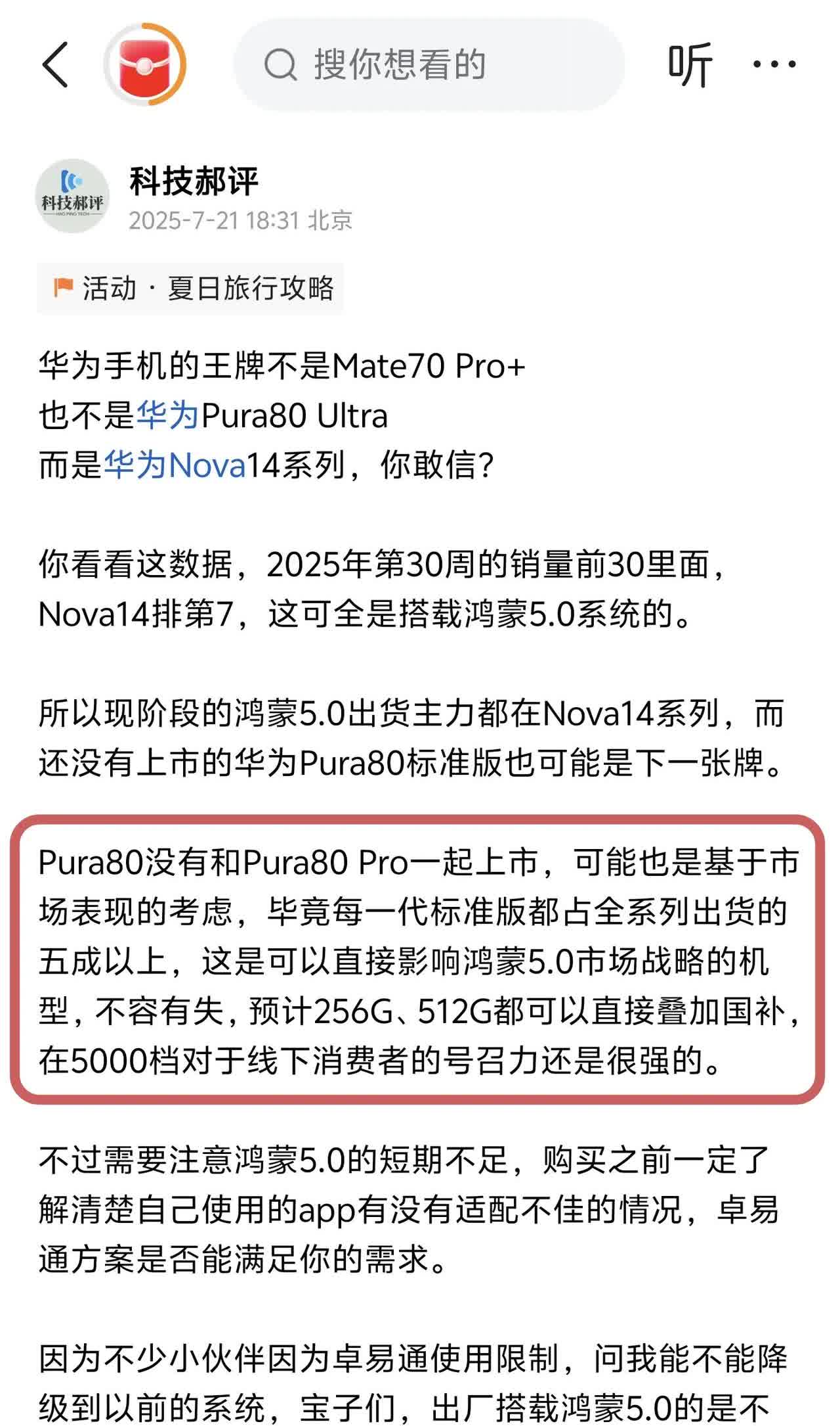 华为Pura80大招来了 直降800,这就是鸿蒙5.0的另一张大牌 降价800,叠加国补500,比Pura70同期同配置可以低1300,这的确对于它的受众来说还是非常有吸引力的。 相当于从原本5000档的价位段,直接变成了4000档了,前两天我还说 Pura 80 没有和Pro一起上市,就是想先试水,看看市场表现怎么样,再决定Pura80的定价,毕竟出货大头一直以来都是标准版。 Pura 80Pro、Pro+、Ultra赚利润,Pura80赚销量,当然华为Pura80全系手机价格说不上低哈,只是对于原本更多偏下线下市场的受众来说,的确相对更便宜了。 鸿蒙5.0推广的两个大招都来了,一个是Nova14系列,一个是Pura80标准版,接下来就要看市场买不买账了,毕竟鸿蒙5.0生态发展起来还需要时间,如果没有达到华为和生态伙伴的预期,那么年底的Mate 80 系列就压力山大了! 80