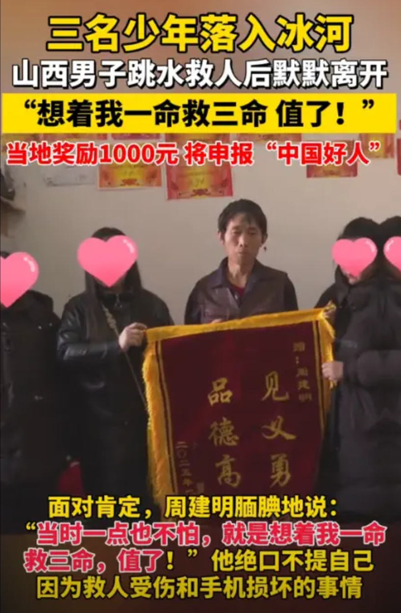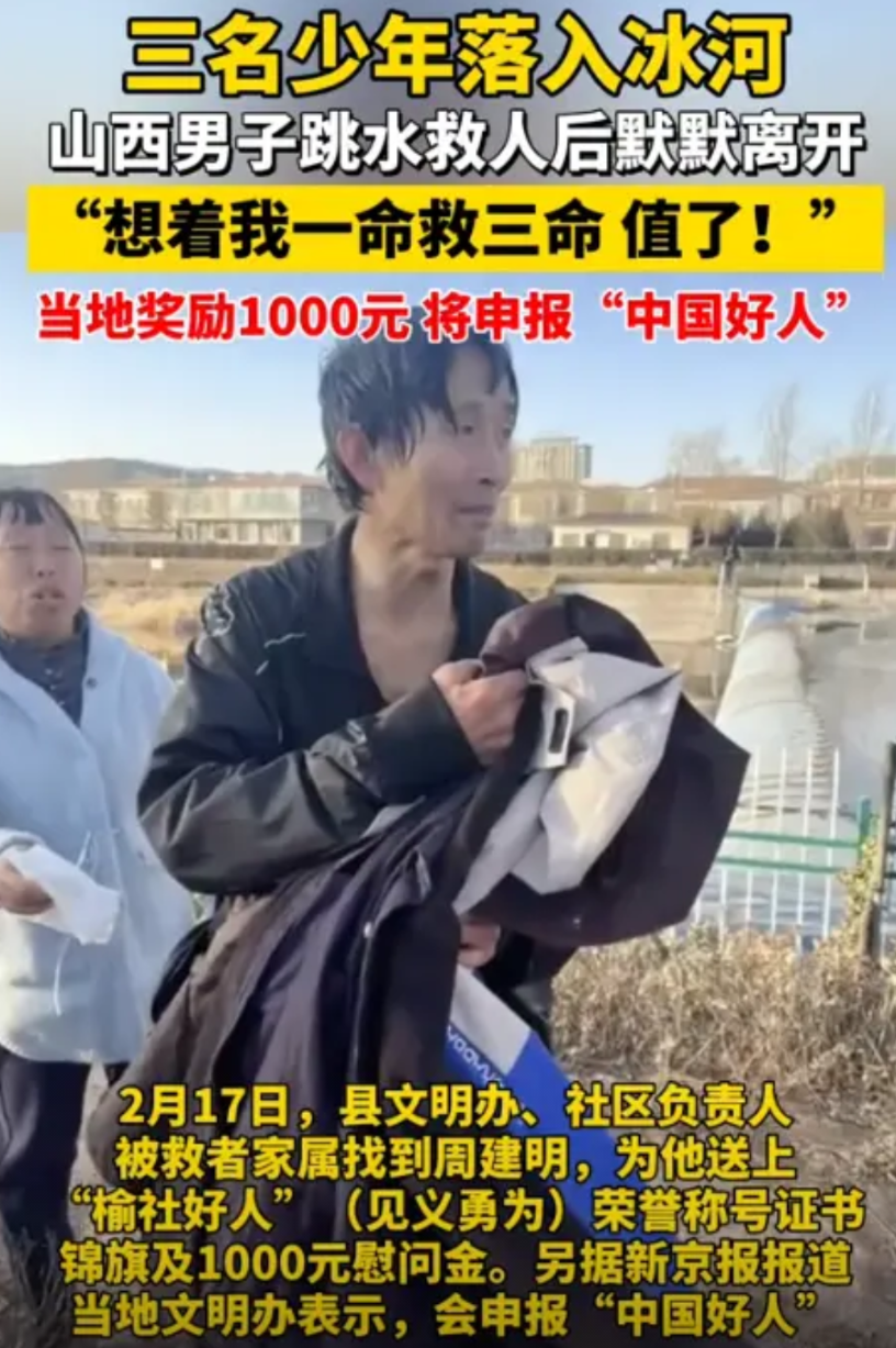 “一命换三命,值了!”2月16日,山西,一名47岁的大叔正在陪妻子和孩子散步。突然看到三个男孩在水中挣扎,正准备跳进去救人时,妻子拉住了他,“你身体不好,别去!”但大叔眼含泪水大喊:“用一命换三命,值!” 据颍州晚报2月18日报道,山西榆社县石勒文化主题公园,晚上的河边冷得像刀子。 47岁的周建明正牵着妻子和儿子散步,突然,几声惊叫划破寂静:“快救人啊!有人掉水里了!” 周建明一激灵,扭头一看:不远处的冰面上,三个孩子掉进水里了,冰层碎了,他们在水中挣扎,只有几只小手还在扑腾。 他没多想,猛地甩开妻子的手就冲了过去。 妻子在后面急得大喊:“你身体不行,别冲动!” 周建明有老毛病,前段时间刚去医院做检查,可那一刻,他什么都顾不上了。 “值!一命换三命,值!”他说完,眼圈红了,随即纵身跳进刺骨的冰河。 冰水像针一样扎进骨头里,可他咬着牙,硬是游过去,把第一个孩子拉了出来。 岸上的人帮忙把孩子拽上岸。还没喘口气,他又转头去救第二个——这孩子吓坏了,一把搂住他的脖子,差点把他也拖下去。 他一边安慰孩子,一边奋力游回岸边。 但最惊险的是第三个孩子,此时冰面又碎了一大片,周建明已经筋疲力尽,四肢都冻僵了,可他还是没犹豫,又一次扎进水里。 水呛进嘴巴和鼻子,他咳得停不下来,但手始终没松。 最后三名孩子都被救了上来。 周建明浑身湿透、嘴唇发紫、只剩一只鞋,手机也泡坏了。 他站在冰冷的河岸边,抖着身子看着那几个孩子安然无恙,然后低头捡起外套,带着家人悄悄离开。 第二天,整个县城都在找这个救命恩人。 孩子家长几经打听才找到了他,一把抓住他的手,哭着不停说谢谢。 政府也为他颁发了“榆社好人”称号,还送去了1000元慰问金。 面对记者,周建明不好意思地挠挠头说:“真没想那么多,就听到喊救命,腿就不由自主地跑了,换谁都一样。” 救人那天,他手被冰划破,虎口裂开一道大口子,可他一句没提。 周建明一家五口,住在政府安置小区,靠打零工过日子。 手机坏了也没跟任何人说过一句,别人问起,他只是笑笑:“人平安最重要,这点事不算啥。” 这件事传到网上,网友一片热议:“这才是真正的英雄!” “在寒冬中跳进冰河的那一刻,我看见了什么叫‘本能里的善良’。” “有些人,没喊口号,却用行动感动了整个社会。” 周建明的这一跳,不只是救了三条命,更让人们重新相信,善良和勇气,并没有随着时代变冷。