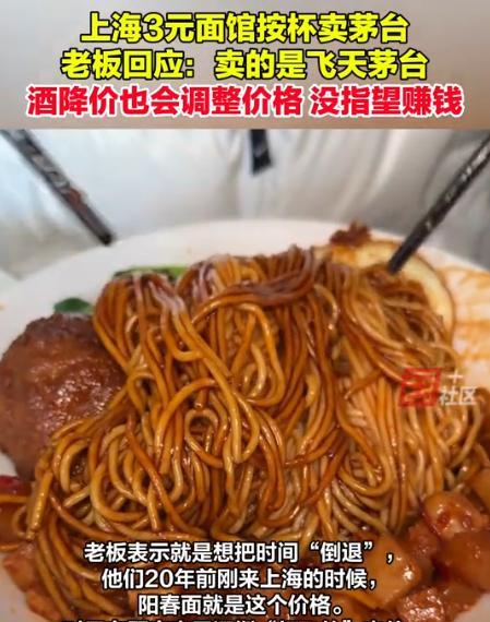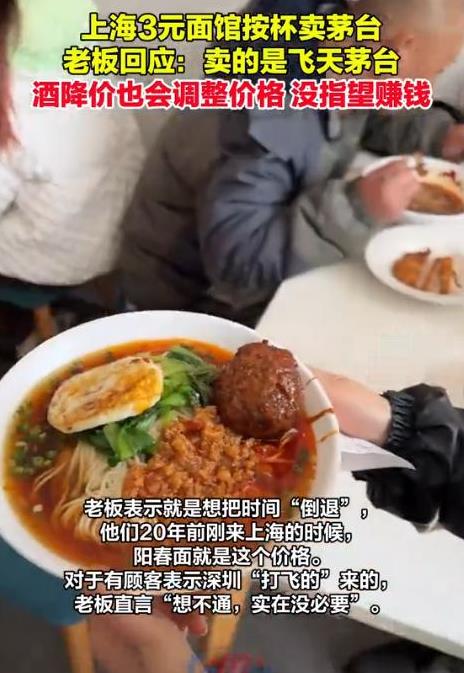 “营销天才啊!”上海,一家面馆老板,卖3元一碗阳春面,同时却以48元一杯的价格出售茅台酒,茅台论杯卖,一杯10毫升,来的人络绎不绝。老板:“纯飞天茅台”! 据国+社区7月24日报道,上海闵行有家小面馆忽然火出圈了,原因听起来有点魔幻它家阳春面只要3块钱,却同时能喝到一杯48元的茅台酒! 一碗平民面,一口“贵族酒”,这强烈的反差感,直接把大家的好奇心拉满了。 这家店叫“塘湾饮食店”,就在华东师大闵行校区。 门面特别朴素,没有什么大招牌,装修也很简单,感觉就像很多人记忆里那种老式面馆。 菜单挂在墙上,价格一看就很亲民,阳春面3元一碗、荷包蛋1块钱一个、大排面18元。而且饭和面还可以免费加量,老板真的是佛心来着。 老板说了,他当年刚来上海的时候,阳春面就卖3块,现在物价涨了,但他还是想保留那份“老味道”和“老价位”,给快递小哥、学生、务工师傅这些辛苦人群一个实惠又温暖的地方。 但最让人惊讶的是:在这家平价面馆里,居然能喝到茅台!还是按杯卖——10毫升一杯,48元。 而且不只是茅台,还有五粮液(24元/杯)、剑南春(12元/杯)……这些平时动辄上千一瓶的高端白酒,在这里竟然只需要几十块就能“尝一口”。 老板的想法也挺特别的,他说:“不是每个人都舍得买一整瓶茅台,但如果按杯卖,大家就能用可承受的价格,体验一下‘高端酒’的滋味。” 更重要的是,他觉得吃3块钱的面不代表不能享受生活,“阳春面配茅台”,就是一种生活态度。 这事一经某博主拍视频发出来后,小面馆直接被网友挤爆。 原本安安静静的小店,突然成了网红打卡地。 有从深圳飞过来只为尝面喝酒的,有老顾客担心以后吃个饭都得排队。 老板也有点哭笑不得。他说自己本来只是想平平淡淡做生意,没想着出名。 但既然火了,他也不会因此涨价,会继续坚持“让老百姓吃得起”的原则。 也有人质疑:3块钱的面会不会偷工减料?48块的茅台靠谱吗?老板回应得很直接:猪肉用的品牌是大牌的,餐巾纸、调味品也都选的是正规厂家。 茅台每瓶都在柜台明摆着,开瓶扫码验真,有客人质疑他还当场演示用防伪APP验证,扫完之后那客人不仅放心了,还立刻又加了三杯。 这家店为什么能火?其实不仅是“价格反差”吸引人,更重要的是:它把“生活的烟火气”和“品味的小讲究”放进了一碗面里、一杯酒里。 你既可以花最少的钱填饱肚子,也可以花点小钱犒劳自己。 对此你怎么看? 信源:国+社区