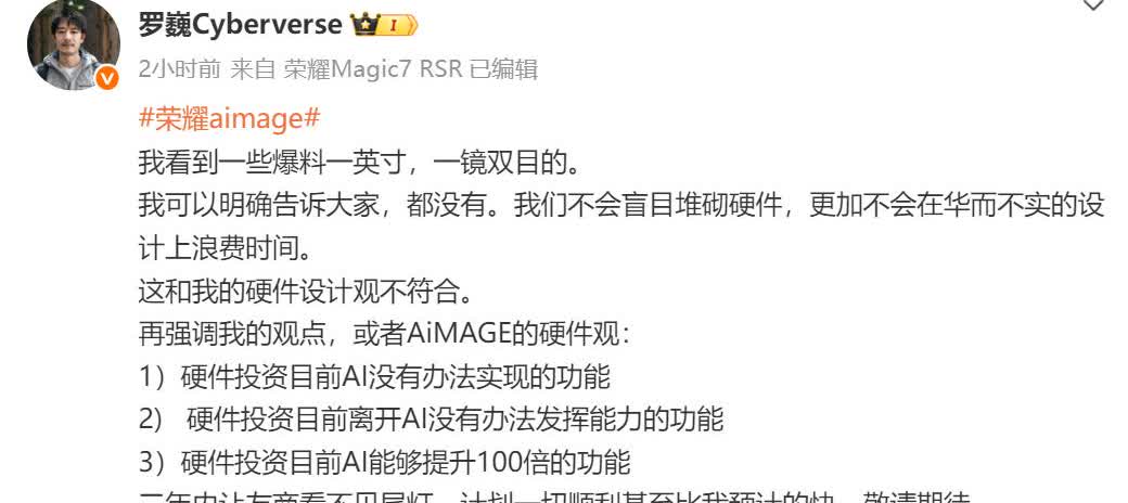 荣耀罗巍评价华为一镜双目:华而不实,浪费时间,荣耀不会用! 最近有爆料,友商也在测试华为Pura80 Ultra同款一镜双目潜望式长焦,不少人怀疑是荣耀。罗工表示荣耀不用这些华而不实,在设计上浪费时间的东西,华为这项技术和荣耀硬件设计观不符。 华为Pura80 Ultra刚发布的时候,罗工就评价过这颗镜头没办法在录像的时候切换焦段,设计上是硬伤。虽然一幕双镜机械结构很精巧,但只是炫技不实用和之前的升降摄像头很像,大胆预测华为自己也会在下一代放弃,荣耀自然更不会用。