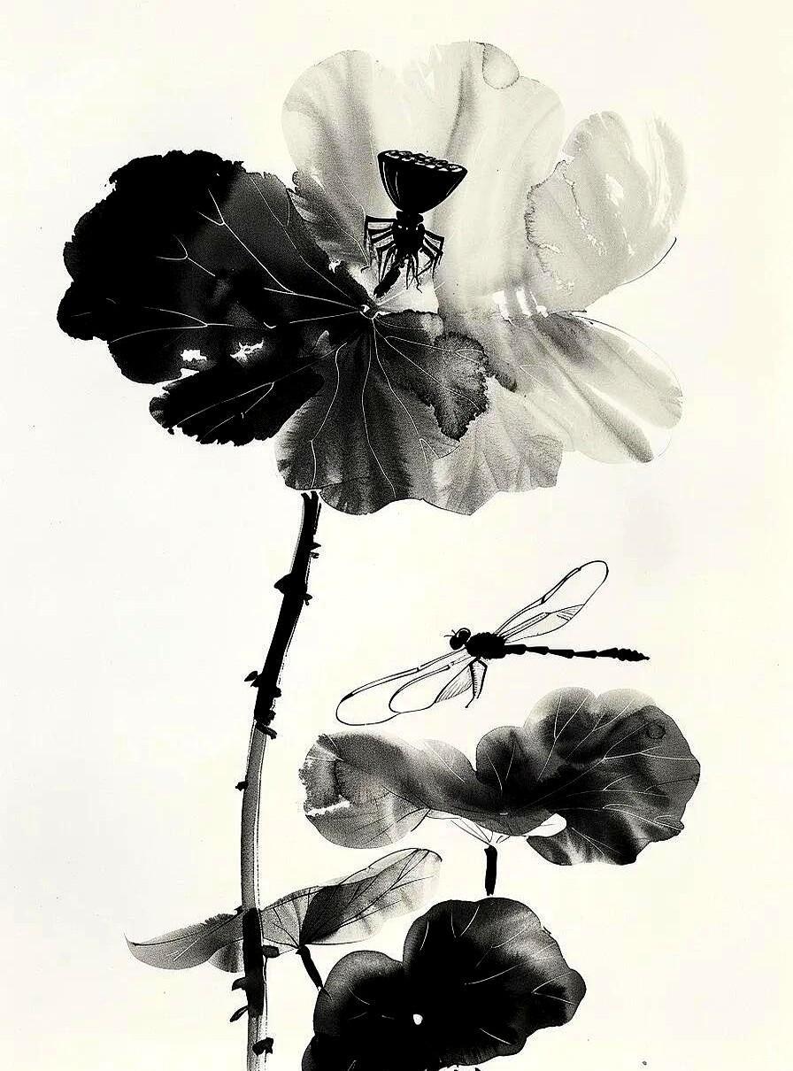 荷花怎么画都漂亮 水墨荷花自带诗意浪漫 有时候加只小蜻蜓就特别有意思翅膀用淡墨