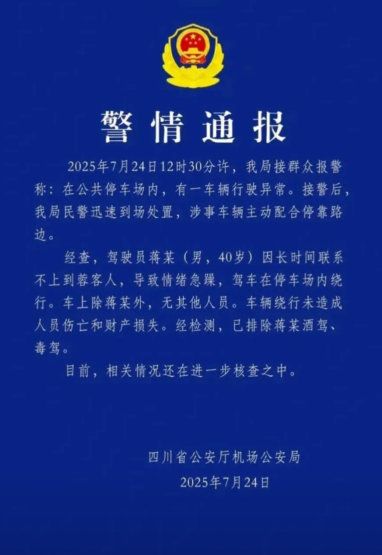 我迪是不是被资本做局了, 比亚迪、机场、滴滴、失控; 各种新闻元素拉满, 网传四川成都天府机场, 一辆比亚迪在停车内绕圈圈不停, 引发了周边居民的围观, 还把交警、消防都干来。 这事放在海狮发布会前, 感觉有点太巧, 希望严查, 警方通报出来了如下图。