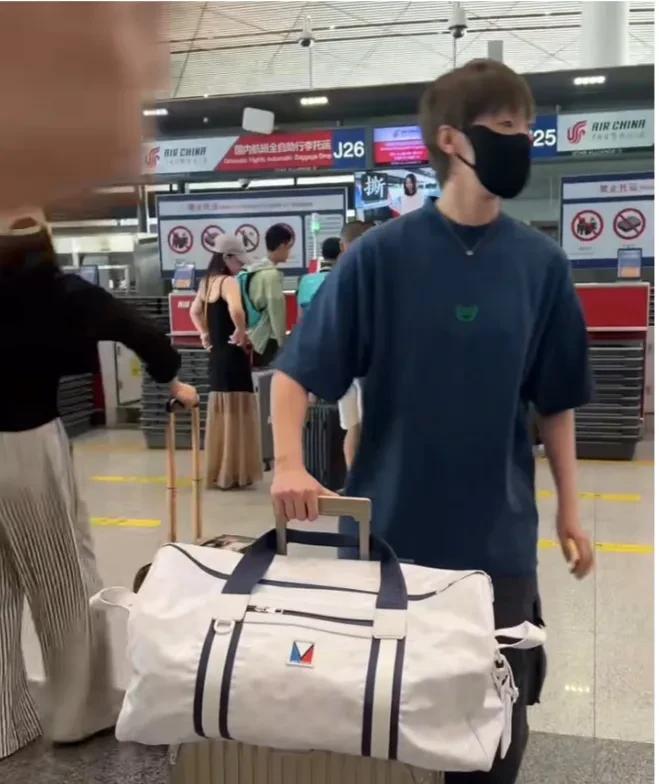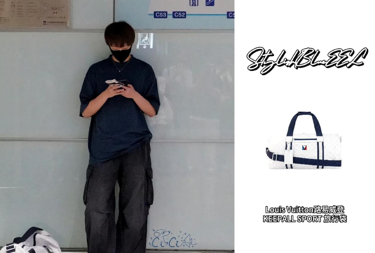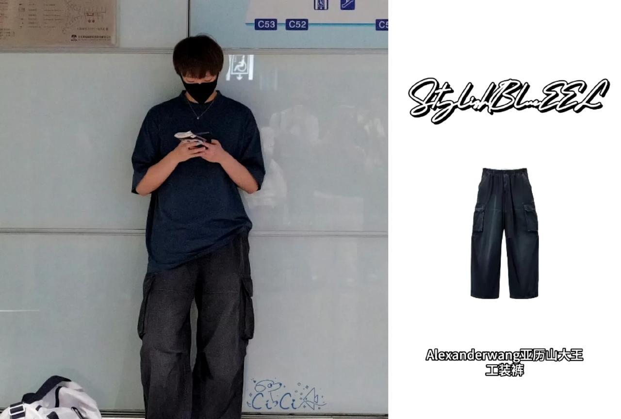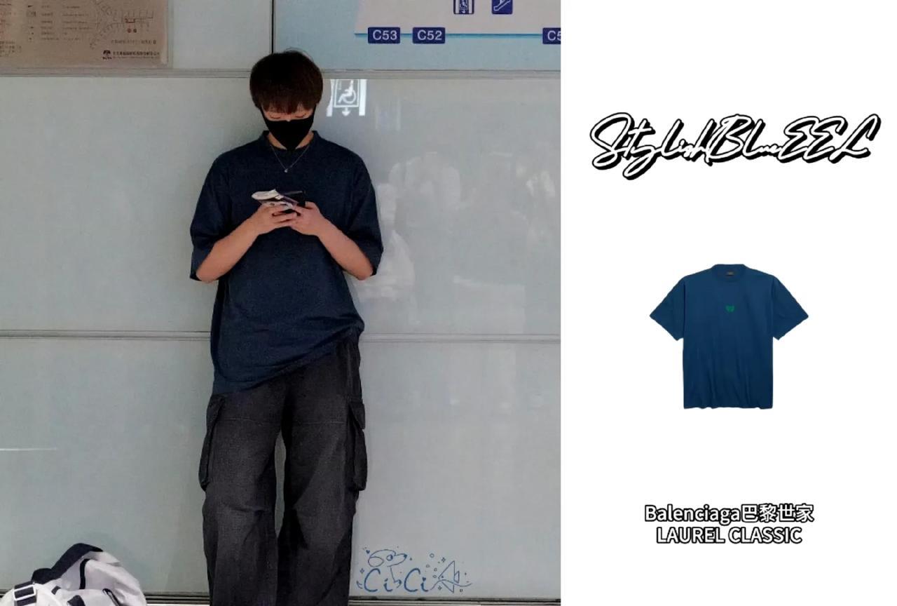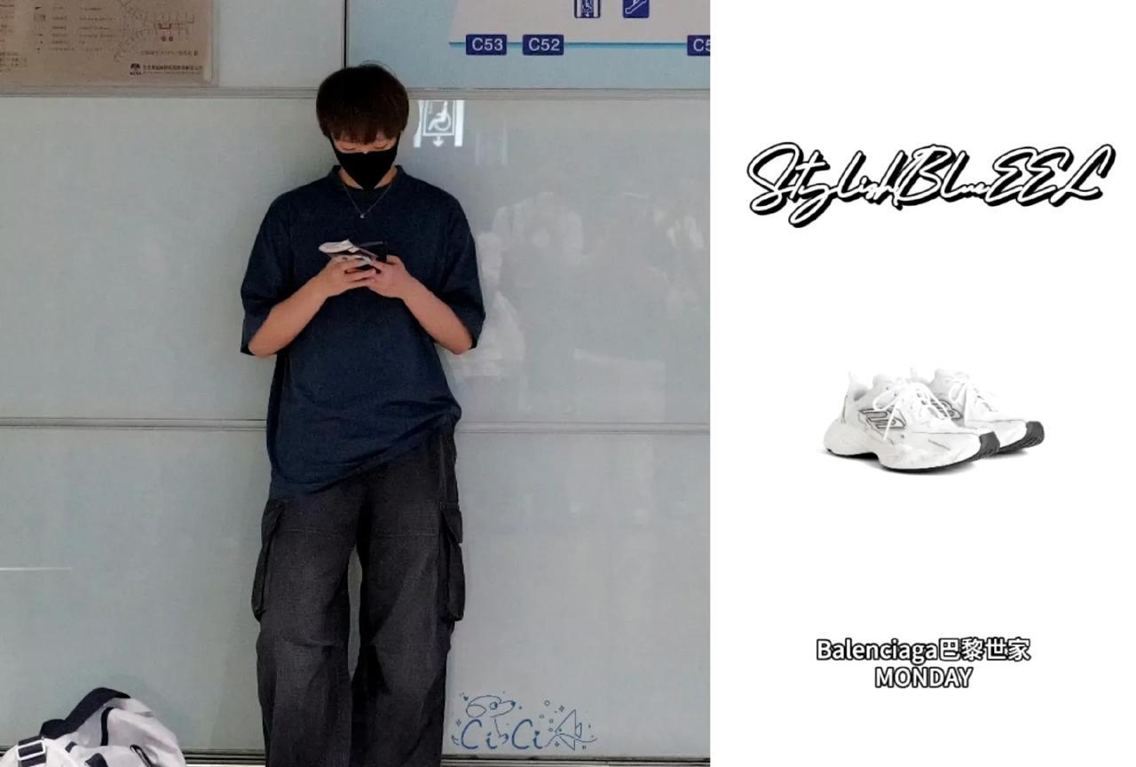 看看王曼昱今天北京出发厦门的这身穿搭有多么的酷炫。 巴黎世家的体恤和休闲球鞋。