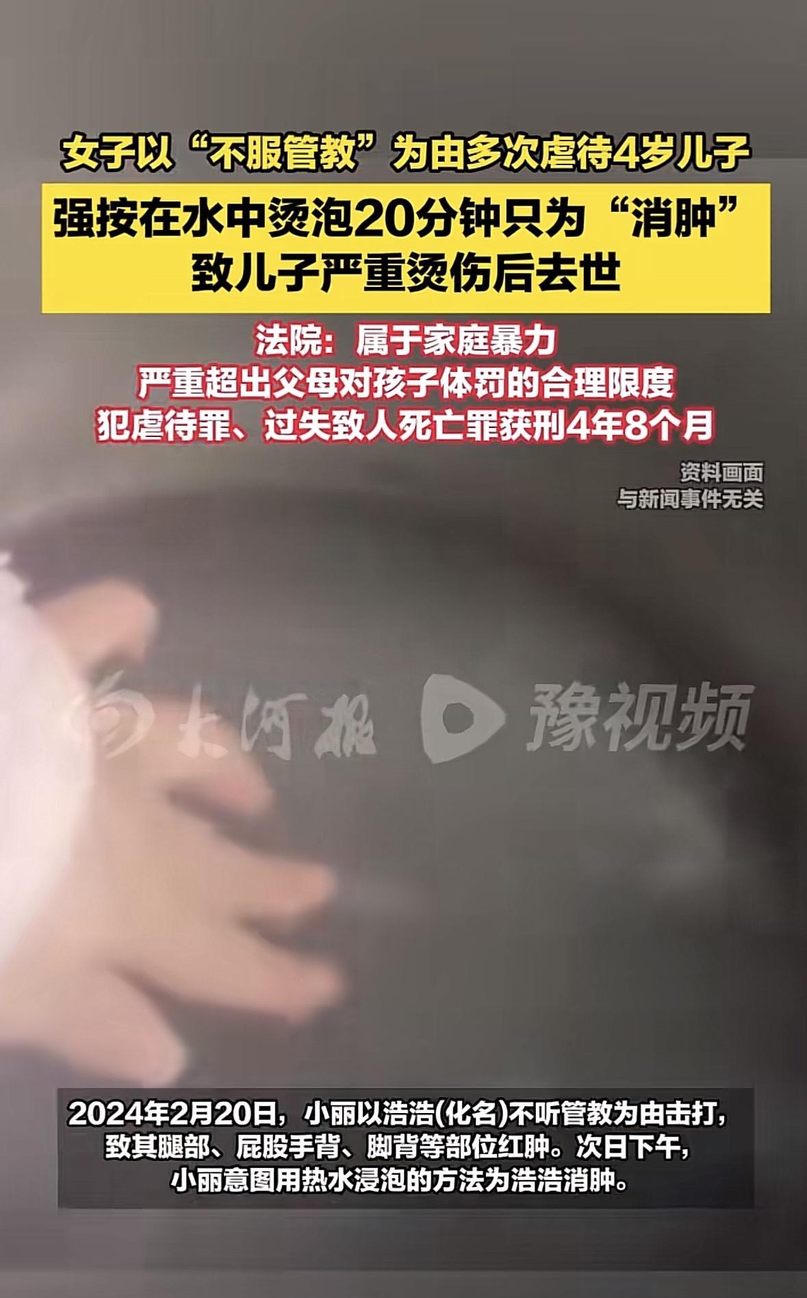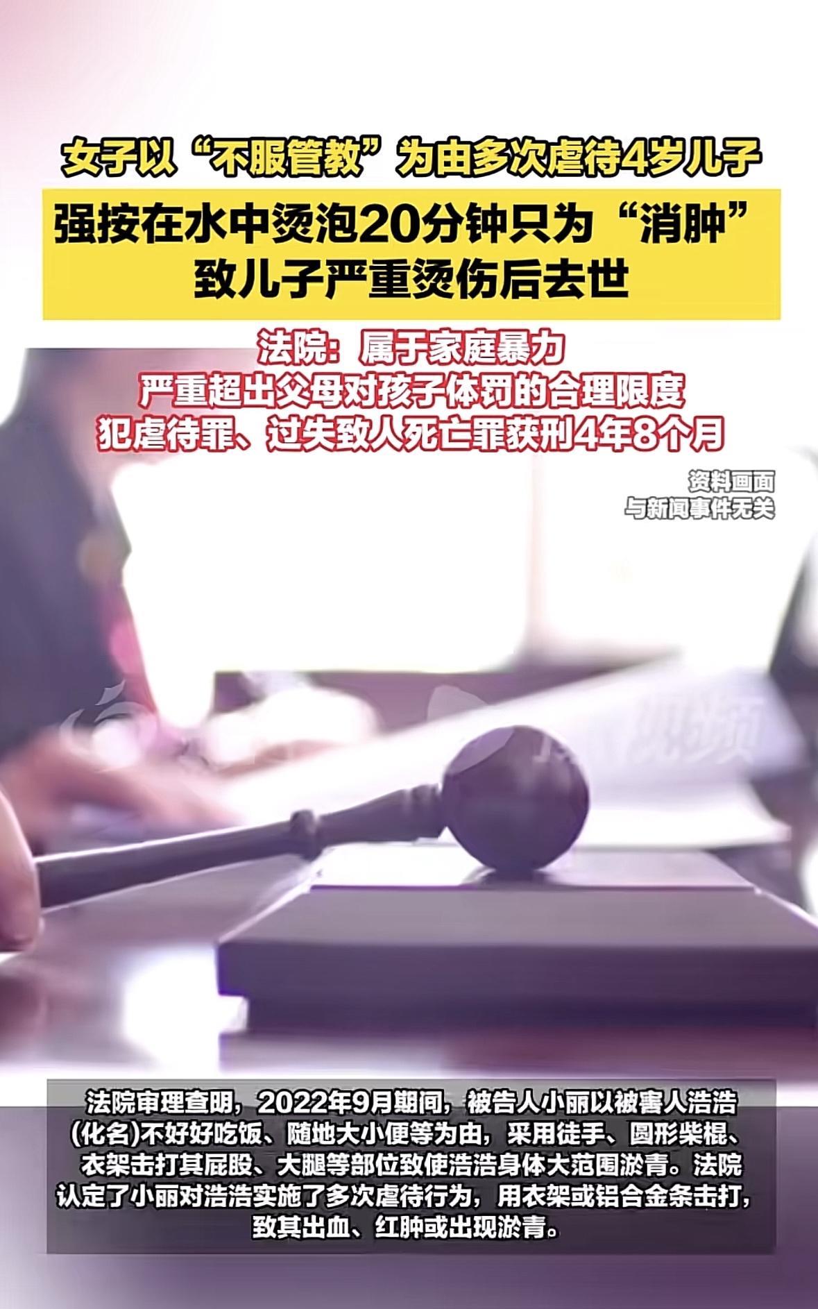 湖北大冶,女子看4岁的儿子总是不好好吃饭,还随地拉尿,就经常用衣架打儿子,这天,儿子被打得浑身红肿,为了“消肿”,女子不顾儿子挣扎,把他摁进高温热水桶里20分钟,儿子出来后手脚冰凉,呼吸也异常,女子害怕了,连忙送医,结果孩子因为烫伤致低血容量性休克,死亡了。法院最终判决出乎所有人的意料。 7月23号,大河报报道,最近法院公开的一份判决书,让一起令人痛心疾首的虐童案浮出水面…… 案件中的受害者是一个年仅4岁的小男孩浩浩,而施暴者竟是他的亲生母亲,小丽。 4岁的年纪,本应是孩子无忧无虑玩耍、享受童年快乐的时光,可浩浩却陷入了无尽的痛苦之中。 小丽仅仅因为浩浩不好好吃饭、随地大小便这些在幼儿时期再正常不过的小问题,就丧失了理智。 她不仅用手,还借助柴棍、衣架,狠狠地击打浩浩的屁股和大腿。孩子那稚嫩的身体哪能承受这样的暴力,不一会儿,浩浩的身体上就出现了大范围的淤青。 浩浩的奶奶得知消息后,心急如焚地赶回家。 看到孙子身上的伤,奶奶心疼得眼泪在眼眶里直打转,她赶紧拍下伤情照片留作证据,同时向村 委会反映了情况。 村 委 会对小丽进行了批评教育,本以为小丽能认识到自己的错误,可没想到这并没有让她收敛。 在之后的日子里,小丽对浩浩的虐待变本加厉。 她多次用衣架或者铝合金条击打浩浩,每一次击打都让浩浩疼得大哭,身上不是出血,就是红肿或者出现淤青。 浩浩小小的心里该是多么恐惧和无助啊,他可能怎么也想不明白,妈妈为什么会这样对他? 2024年2月20日,悲剧再次上演。 小丽又以浩浩不听管教为由,对他进行殴打。浩浩的腿部、屁股、手背、脚背等部位都被打得红肿。 此时的浩浩,身体和精神都已经到了崩溃的边缘。 第2天下午,小丽不知道是出于怎样的荒唐想法,居然准备用热水浸泡的方法给浩浩“消肿”。 她要求浩浩进入放着高温热水的水桶里。浩浩刚把脚踏进去,就连忙拿出来,直喊水太烫了,想要挣脱出来。 可小丽却像着了魔一样,不顾浩浩的感受,强行把浩浩摁进热水里,这一摁就是长达20分钟,完全不顾浩浩撕心裂肺的哭喊声。 当小丽把浩浩从水中抱出来时,浩浩身上皮肤大面积脱皮。可即便如此,小丽还是没有第一时间送浩浩去医院。 她只是用红霉素软膏涂抹浩浩身体的烫伤位置,后来发现浩浩的手脚冰凉,她居然还是觉得无所谓,又用吹风机去吹热浩浩的手脚。 直到发现浩浩的腰间出现红色斑点、心跳和呼吸也不正常,小丽才慌了神,把浩浩送往医院抢救。 可一切都太晚了,浩浩被送到医院时,已经没有了生命体征。 结果显示,浩浩是在体表多发性软组织损伤的基础上,又因为烫伤导致低血容量性休克,最终死亡的。 而害死浩浩的,就是他的亲生母亲,小丽。 那么,从法律角度来看,小丽将会面临怎样的惩罚? 《刑法》第260条之一规定:对未成年人负有监护、看护职责的人虐待被监护、看护的人,情节恶劣的,处三年以下有期徒刑或者拘役。 小丽作为浩浩的亲生母亲,对浩浩负有法定的监护职责。监护职责意味着要保障被监护人的基本权益,包括生命健康、人身安全以及合理的成长环境等。 小丽本应悉心照料浩浩的生活起居,引导其健康成长,但她却多次实施虐待行为,严重违背了监护职责。 小丽的行为符合“情节恶劣”的标准。她多次虐待浩浩,给浩浩的身体造成了严重的伤害。 而且,在浩浩被热水烫伤后,她没第一时间送医,而是采取不当方式处理,最终导致浩浩因烫伤致低血容量性休克而死亡。 这些行为对浩浩的身心造成了极大的痛苦和伤害,严重损害了浩浩的合法权益,属于典型的情节恶劣。 《刑法》第233条规定:过失致人死亡的,处三年以上七年以下有期徒刑;情节较轻的,处三年以下有期徒刑。本法另有规定的,依照规定。 法院认为,小丽在要求浩浩进入高温热水桶消肿这一行为上,存在明显的过失。 她应当预见将年仅4岁的浩浩强行摁入高温热水中长时间烫泡,可能会导致浩浩严重烫伤甚至危及生命,但因为她主观上的疏忽大意或者过于自信,没有尽到应有的注意义务,没有预见到这一严重后果。 她可能认为用热水泡一下不会造成太大伤害,或者觉得浩浩能忍受,这种错误的主观判断导致了悲剧的发生。 而事发后,她没有第一时间把孩子送医,而是使用红霉素软膏涂抹和使用吹风机吹等不当方式处理,最终造成浩浩因烫伤致低血容量性休克而死亡。 客观行为与死亡结果之间存在直接的因果关系。 法院审理后认为,小丽的行为已经远远超过了正常家庭教育的界限,属于家庭暴力。 最终,法院一审以小丽犯虐待罪判处有期徒刑六个月,犯过失致人死亡罪判处有期徒刑四年六个月,合并执行有期徒刑四年八个月。 有人认为,孩子受虐致死,才判4年多,这个结果让人难以接受。 对于这个判决结果,你怎么看? 关注@猫眼学法 多学法律知识少走弯路!