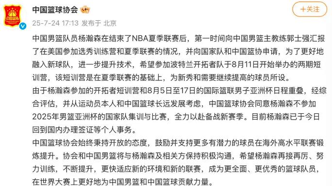 中国篮协为何让杨瀚森错过亚洲杯?这背后有哪些考量? 中国男篮队员杨瀚森将不会参加即将举行的2025年男篮亚洲杯。中国篮球协会表示,这一决定是为了让杨瀚森能够更好地融入新球队并提升个人技术,他将参加波特兰开拓者队的短训营。杨瀚森在结束NBA夏季联赛后,向教练组汇报了情况并提出申请,经过综合评估,中国篮协认为这对运动员和个人篮球事业长远发展有利。杨瀚森已回到国内办理相关事务,全力备战新赛季。