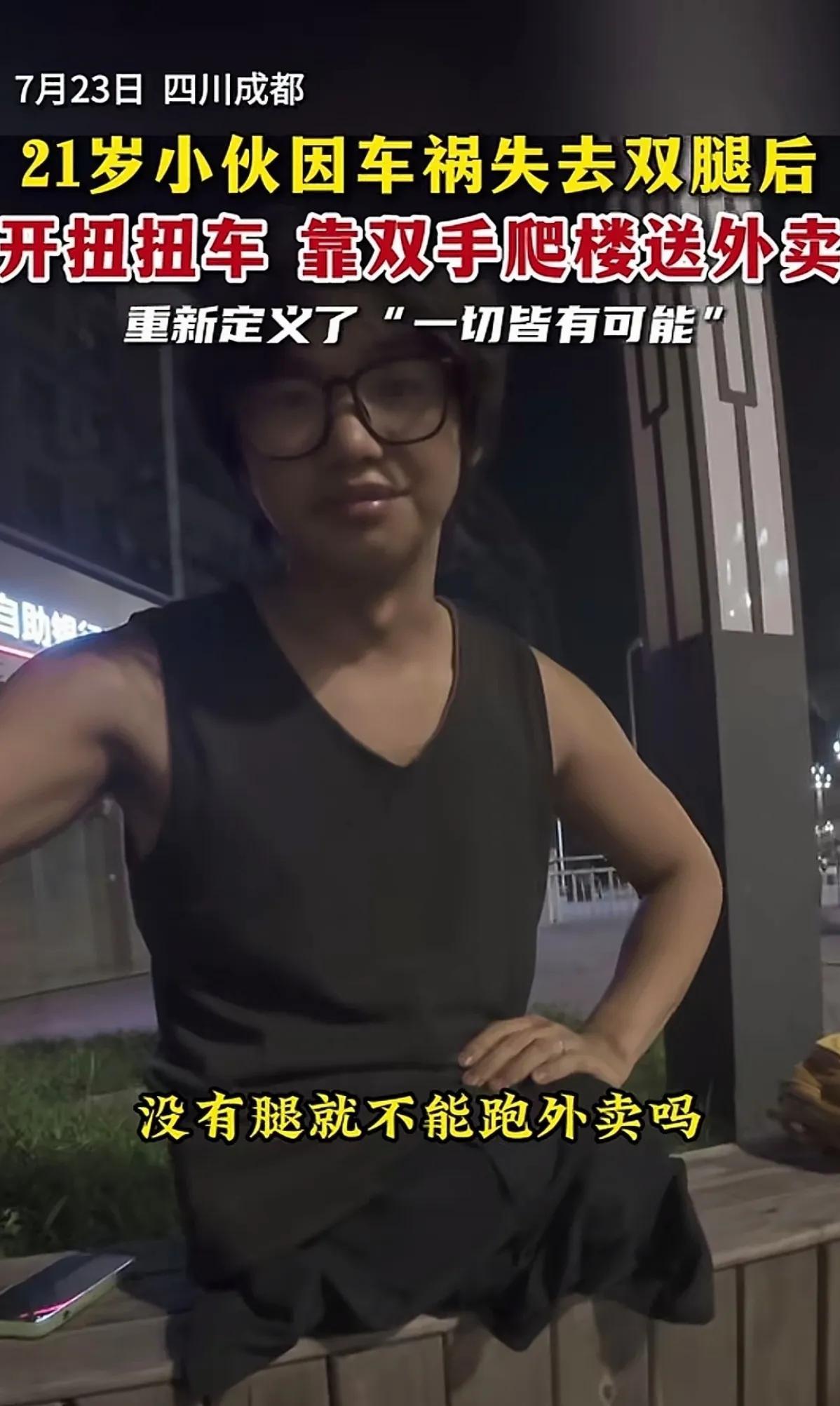 没腿也要跑外卖,这就是生活。 四川一21岁小伙因车祸失去双腿,没有自暴自弃。 而