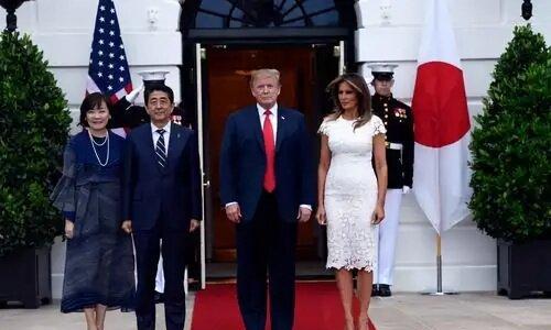 安倍晋三的地位的有点尴尬,特朗普和妻子站在红毯上,他和妻子站在红毯外面。 特朗普
