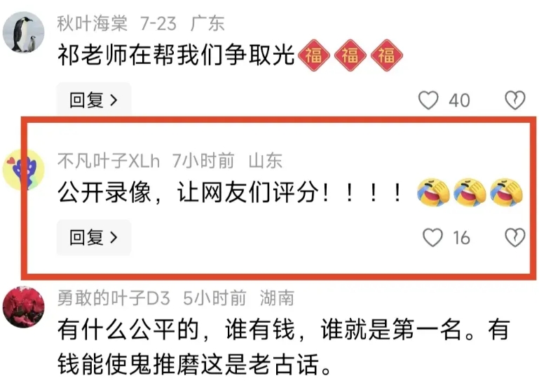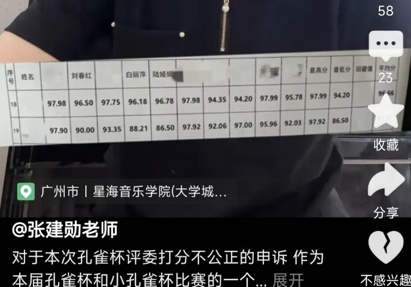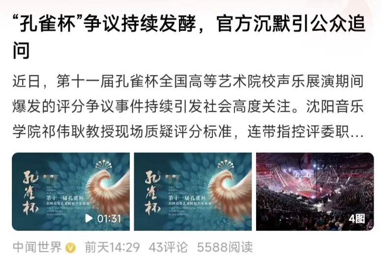 孔雀杯现场,一位教师硬刚一群现场评委,结果这群评委落荒而逃,用落荒而逃这几个词来形容并不过分,面对沈阳音乐学院祁老师的追问,没有一个评委敢站起来大声的申辩。孔雀杯全国高等艺术院校声乐展演现场,祁老师认为评委的评分标准非常不公平,并明确指出其中一个学生为何抬高分数,后来看到另一个视频,另外一个以第二名入围的学生,结果分数罕见的被压低到86分。 当然,这些只是我们从视频看到的,具体情况怎么样,官方到现在没有给出说明,任由祁老师追逐评委出现场下楼梯四散分散开来的场面在网上流传,如果心中无愧,那么多评委怎么会惧怕一个老师。现在我们还不知道具体情况,但我真的要为祁老师点赞,大部分人面对这种情况可能选择了隐忍,但如果人人都隐忍,就会有更多不公平的事情发生。祁老师说了一句很狠的话,你们这些评委是对教育的破坏,你们的职称是怎么来的。 我们希望看到官方的正式回复,这些分数究竟有没有猫腻。其实最简单的方法,把这个被抬高和被压低的两个学生的唱歌视频公开,让网友来评一评,是否存在明显的不公平。