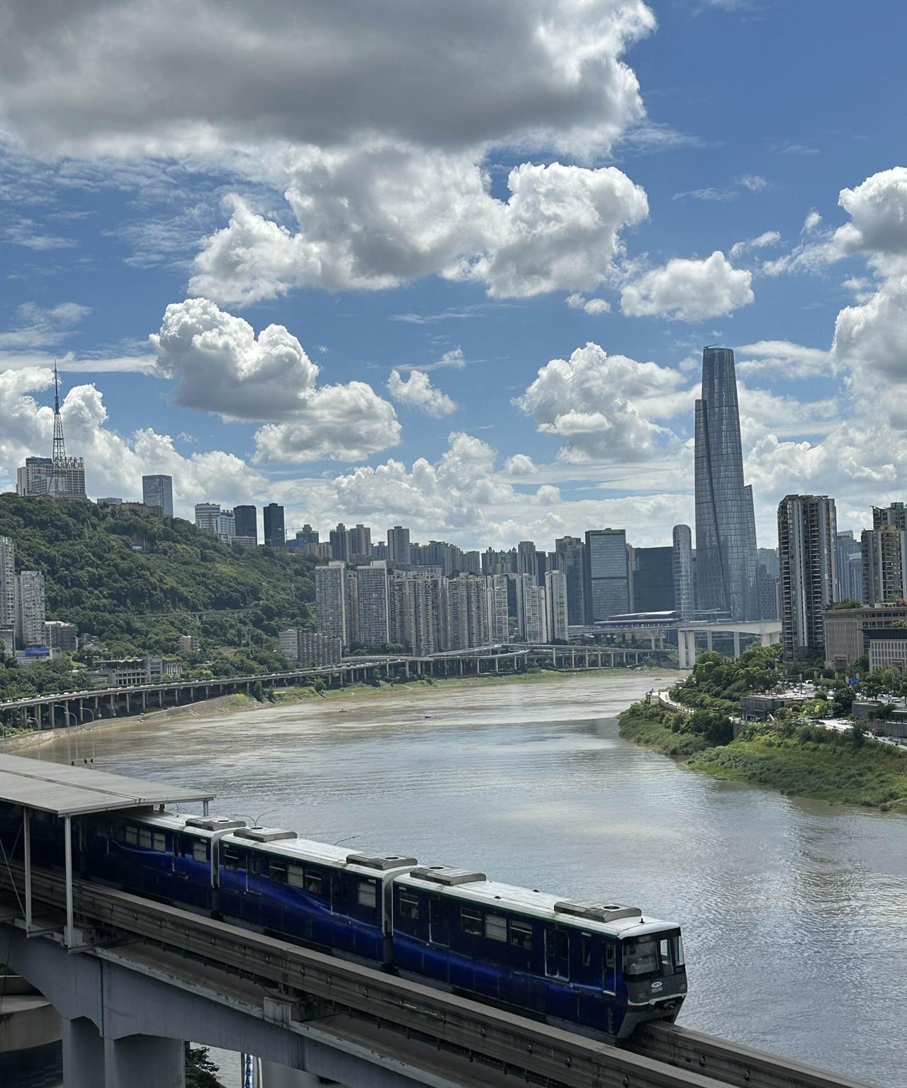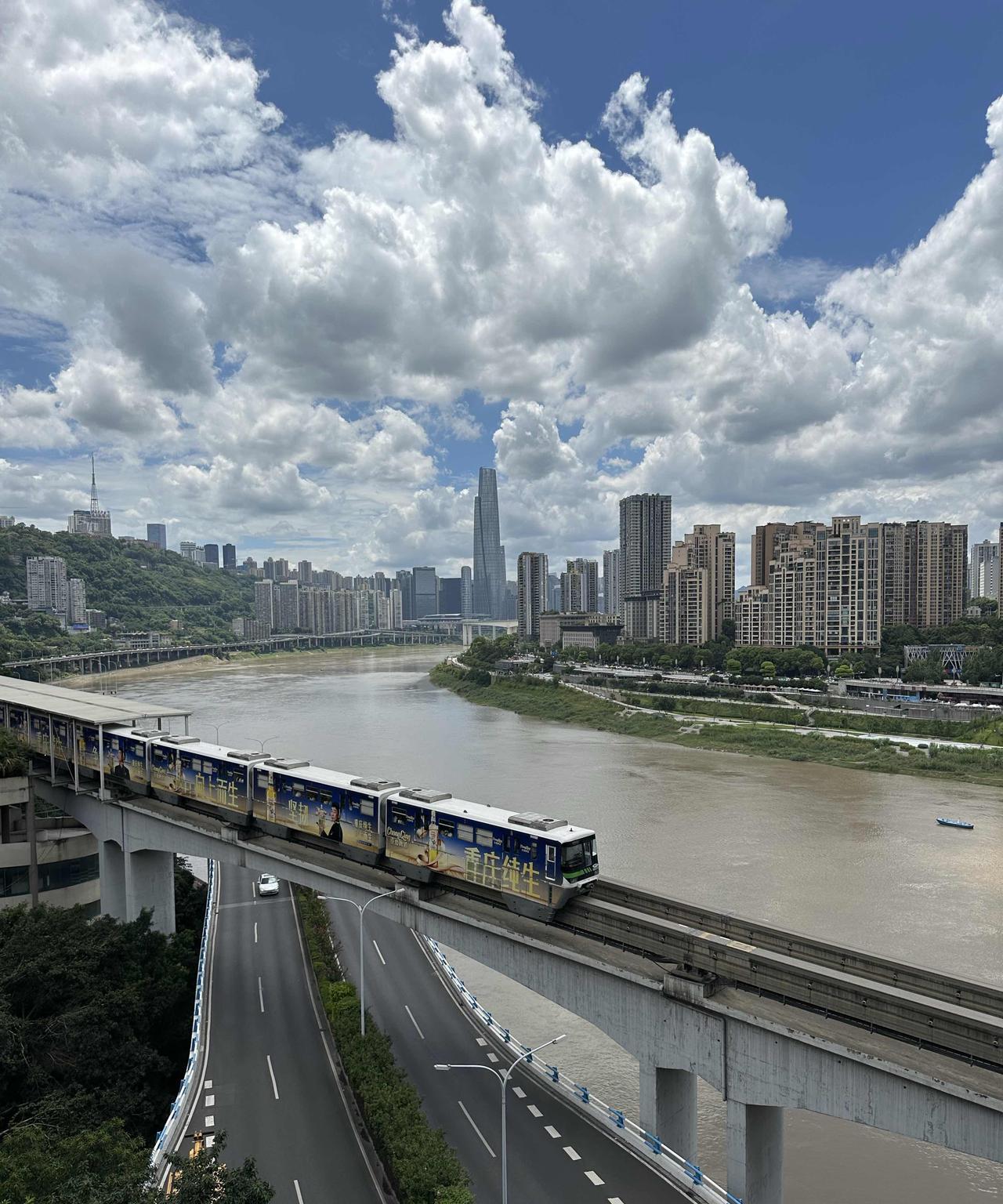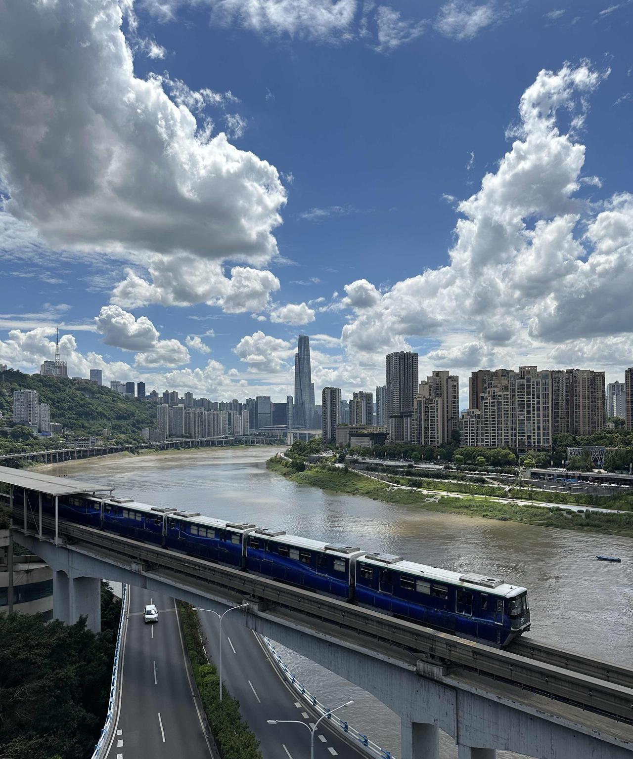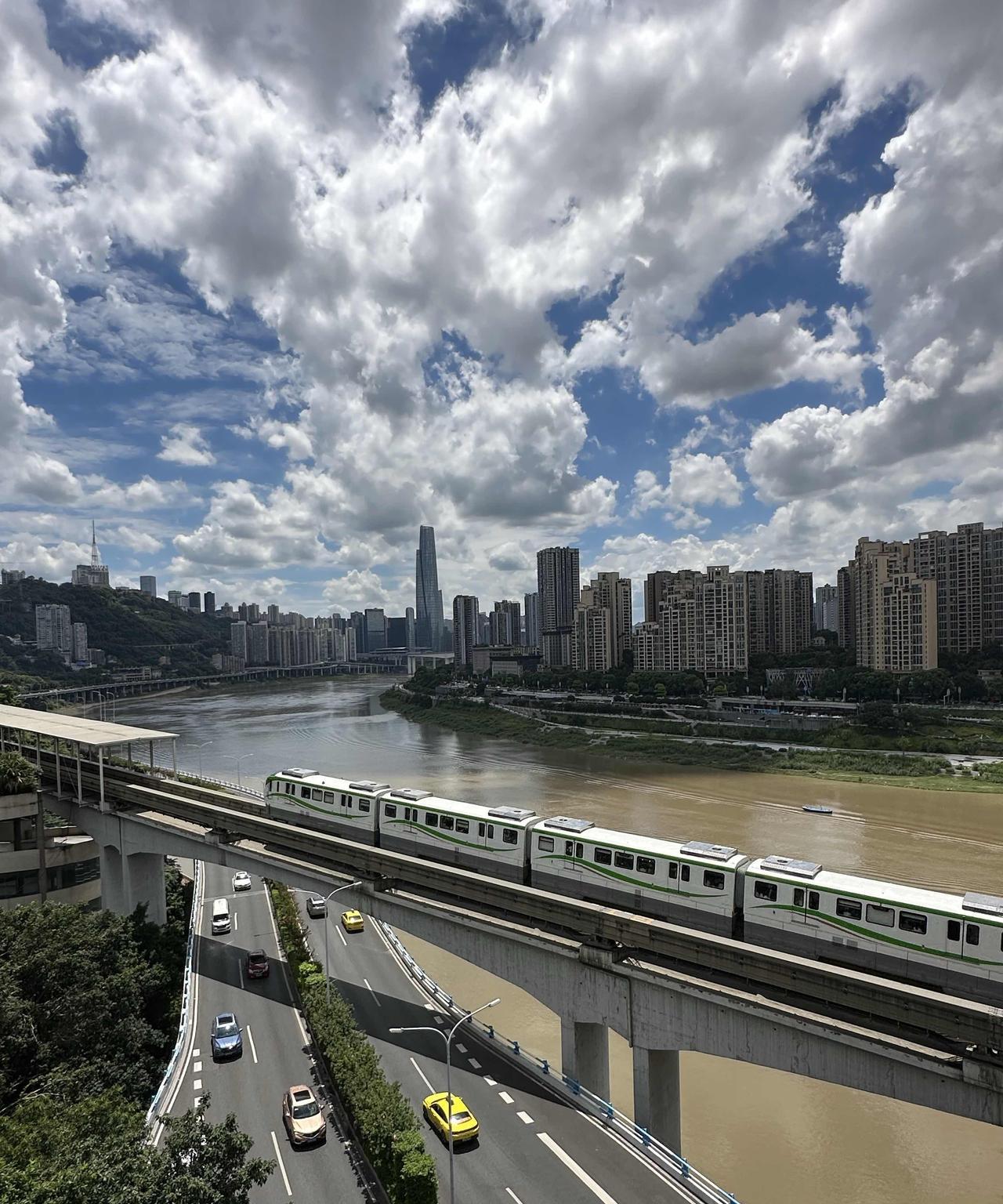 重庆轻轨2号线和3号线的换乘站--牛角沱站,确实是欣赏重庆2号线列车穿行在蓝天白