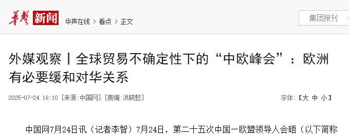 在中欧峰会落下帷幕后,欧盟委员会主席冯德莱恩的一番言论,再度将中欧经贸关系中的深层次矛盾推至台前。 她大谈特谈 “自由贸易的力量”,却又在话锋一转间强调 “必须是公平的”,声称欧中经贸关系 “再平衡”, 才是双边关系健康发展的基石。 然而,这番看似冠冕堂皇的话语背后,实则隐藏着诸多算计,提及 “自由贸易”,欧洲在这一概念的实践中,往往展现出极为功利的一面。 以汽车行业为例,德国奔驰等品牌在中国市场,长期占据高端汽车销售的主导地位,享受着中国庞大汽车消费市场带来的丰厚红利。 但当中国企业试图反向进入欧洲市场时,重重阻碍接踵而至,当比亚迪、蔚来等中国品牌,凭借技术创新与成本优势,逐步在国际市场崭露头角,计划开拓欧洲市场。 欧盟迅速启动反倾销调查,以所谓 “低价倾销” 为由,对中国新能源汽车加征高额关税,税率一度高达 20% - 30%,严重削弱中国车企在欧洲的价格竞争力。 在 5G 技术合作方面,华为等中国企业在欧洲市场拓展业务时,欧盟部分成员国无端以 “安全” 为由,禁止华为参与当地 5G 网络建设,将纯粹的商业合作政治化,完全背离了自由贸易的精神。 “产能过剩” 更是一个站不住脚的借口,中国作为全球制造业的核心枢纽,拥有完备的产业链和强大的生产能力。 以光伏产业为例,中国生产的光伏产品供应全球近 70% 的市场需求,不仅为欧洲的清洁能源转型提供了关键支撑,还大幅降低了欧洲企业和民众使用太阳能的成本。 在欧洲,许多家庭和企业得益于中国物美价廉的光伏板,实现了能源的自给自足或部分自给,有效降低了能源开支。 欧洲一些行业竞争力下滑,根源在于自身产业结构调整滞后,未能及时跟上全球产业变革的步伐,同时内部成本控制不力,劳动力成本、能源成本居高不下。 在新能源汽车领域,中国企业通过长期研发投入,掌握了电池技术、自动驾驶等核心科技,实现了规模化生产与成本控制。 而欧洲车企在转型过程中,决策迟缓,对新能源技术研发投入不足,导致产品在性能、价格和智能化程度上落后于中国企业。 面对市场份额被中国企业逐步蚕食的局面,欧洲车企不是反思自身问题,而是游说政府,将责任归咎于中国的 “产能过剩”,试图通过行政手段限制中国企业发展,维护自身既得利益。 高端机床方面,德国、瑞士等国的先进机床制造企业,在政府干预下,对中国企业设置重重出口障碍,限制中国高端制造业的升级。 然而,当中国基于国家安全和产业发展需求,对部分关键资源和技术,如稀土、部分高端无人机技术实施合理出口管制时,欧盟却迅速跳出来指责中国破坏全球产业链、供应链稳定。 但事实上,中国的出口管制措施完全符合国际法和国际惯例,而欧盟的技术封锁则是典型的霸权思维作祟,惧怕中国通过技术创新打破其长期占据的技术垄断地位。 当前,欧洲经济面临严峻挑战,通胀高企、经济增长乏力,在此背景下,加强与中国的经贸合作,本是欧洲摆脱困境的重要途径。 但冯德莱恩选择以指责、施压的方式,试图迫使中国单方面让步,这种短视行为不仅无法解决欧洲自身经济问题,反而会严重损害中欧之间来之不易的互信基础。 真正的公平贸易,绝非单方面的要求与胁迫,而是需要双方在相互尊重、平等协商的框架下,寻求利益的平衡点。 欧盟若真心希望推动中欧经贸关系 “再平衡”,实现可持续发展,当务之急是摒弃偏见与双重标准,停止对中国无端指责,取消不合理的贸易壁垒,以真诚、务实的态度与中国开展深度合作。 只有如此,中欧双方才能在经贸领域持续收获共赢成果,推动中欧经贸关系沿着健康、稳定的轨道行稳致远。 反之,若欧盟继续秉持算计与施压的错误心态,最终必将使双方利益受损,付出惨重代价 。