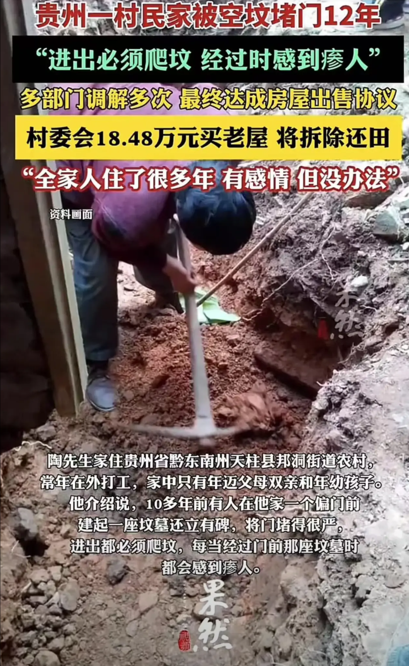 贵州,一男子外出打工,家中只剩老人和孩子,没想到其宗族族长却在他家门口悄悄建起了坟墓,堵住了家门。整整12年,老人和孩子每次进出都得爬过坟墓。男子知道后多次申诉,却始终未能解决问题,最后无奈卖房!网友怒斥:“这种行为简直是在欺负老实人,凭什么要忍受这种霸道行为?” 在贵州黔东南州天柱县的一个山村里,陶青峰陶家与一座空坟的纠缠持续了整整十二年,直到2025年夏天,随着老屋被村委会买下拆除,这场横跨三代人的荒唐纠纷才终于画上句号。 可对于陶青峰一家人来说,这样的结局里藏着太多无奈与心酸。 事情要从2013年清明说起。 当时村里的陶氏“族长”陶磊拿着族谱找到陶青峰家,说族谱记载五百年前明朝成化年间的老祖宗就葬在陶青峰家偏房旁边,要带人挖地寻遗骸。 陶磊在村里威望不低,既是前村主任,又是修族谱的主持人,很快就组织了十多个族人,在镇调解委员会的人见证下,在陶家偏房旁开挖起来。 挖了几天啥也没找到,只挖出些黑泥巴,陶磊却一口咬定老祖宗就葬在这儿,转头就带人用砖石在陶青峰家偏门旁砌了座空坟,还立了块石碑,把侧门堵得严严实实。 其实这事儿早有伏笔。 2010年,陶磊在陶家地里栽了棵杨梅树当“风水树”,陶家发现后把树拔了,两家从此结了怨。 而陶青峰常年在浙江打工,家里只有年过六旬的父母和年幼的女儿。 老两口当时拼命拦着,可根本拦不住人多势众的陶磊一伙。 偏门被堵后,进出只能爬坟,老人得先攀着墙,再弯腰抓着坟上的砖石小心翼翼挪过去,小孙女每次经过都吓得不行,大白天出门都得爷爷奶奶陪着。 好好的家,愣是被一座空坟搅得鸡犬不宁。 当年四月,在镇调解委员会的撮合下,陶青峰的父亲被迫签了份协议,同意陶家拆墙让出一米宽的地方给陶氏立碑。 可陶青峰打工回来后坚决不认这份协议,找派出所报警,对方说这是民事纠纷管不了。 2014年,陶家把陶磊等六人告到法院,要求拆坟赔钱,没想到陶磊他们反倒反诉,说陶家盖房修猪圈占了祖坟地。 法院审理后说这事儿归行政部门管,不属于民事案件,把两边的诉求都驳回了。 接下来的九年里,陶家没少跑部门。 镇政府、街道办、民政局来回找,各级部门前前后后调解了十多次,可清官难断家务事。