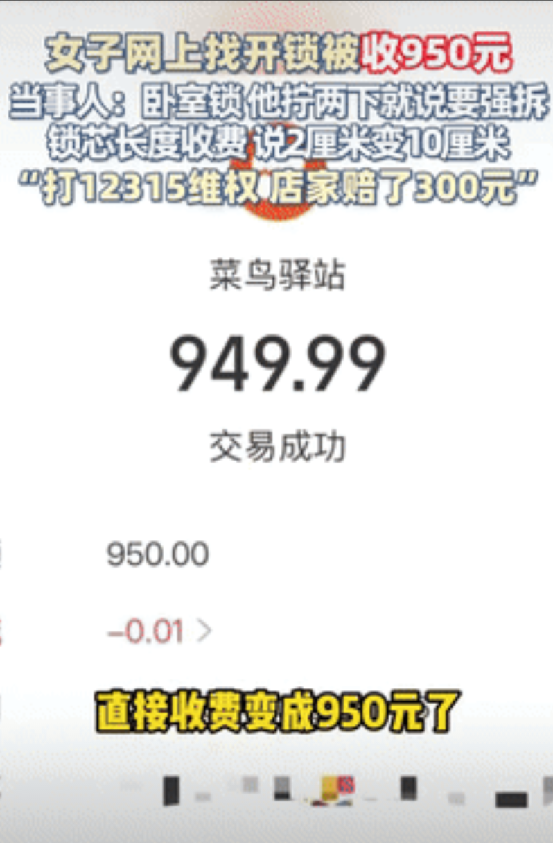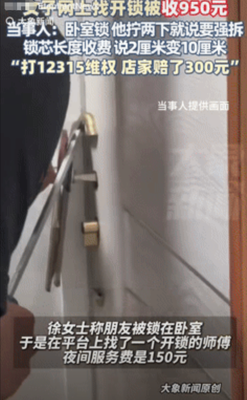 “缺德到家了!”辽宁沈阳,一女子因朋友被锁在卧室,就在网上找了名开锁师傅,夜间服务费是150元,没想到,师傅拧了两下卧室门,就说要强拆,并表示费用按锁芯长度收费,预计2厘米200元,女子同意了,可把门拆开后,却要求女子支付950元,网友:按厘米收费,长了见识了! 我一个人怕他做出过激行为就给了,但我没想到事后投诉才赔偿我300,这下是真的亏大了!”女子无奈的说道,这句话引发了无数网友的关注和讨论,事情的起因看似简单,却折射出生活中那些让人防不胜防的陷阱。 事情发生在辽宁沈阳,那天这位女子的朋友因为一些原因被锁在了卧室里,外面又没有备用钥匙,情急之下女子决定在网上找一名开锁师傅,在网络上搜索相关信息后,她联系到了一位看起来评价还不错的开锁师傅,师傅表示夜间服务费是150元,女子觉得这个价格还算合理,便同意了。 师傅很快来到了女子家中,起初师傅表现得还挺专业,拿着工具在卧室门上拧了两下,似乎在尝试用专业的方法打开门锁,然而就在女子满怀期待地等着门被打开时,师傅却突然说:这锁打不开了,得强拆,”女子一听,心里咯噔一下,但考虑到朋友还在里面,时间紧迫,她只能无奈地点头同意。 接下来师傅开始说起收费方式,他声称费用是按锁芯长度收费,预计2厘米200元,女子虽然觉得这个收费方式有点奇怪,但也没有多想,毕竟只是2厘米,200元应该不会太离谱,她想着只要能尽快把门打开,让朋友出来,这点钱也值了,于是她同意了师傅的说法。 师傅开始动手拆门,那动作看起来有些粗暴,女子心里有些担心,但也没有多说什么,师傅一边拆门一边继续解释收费方式,说锁芯越长费用越高,女子心里虽然有些不安,但想着师傅毕竟是专业人士,应该不会坑自己,便没有过多质疑。 然而当门被拆开后师傅却突然变卦了,他指着拆下来的锁芯说,锁芯长度超过了预期,预计需要支付950元,女子一听顿时傻眼了,她原本以为只是简单的2厘米200元,没想到最终竟然要支付950元,她试图与师傅理论,但师傅态度强硬,坚持要按照新的收费标准收费。 女子无奈之下,只能先支付了950元,事后,她越想越觉得不对劲,于是决定投诉,经过一番努力,她最终只追回了300元的赔偿,女子感到非常委屈,觉得自己不仅被坑了钱,还浪费了时间和精力。 这件事情在网络上曝光后,引发了广泛的关注和讨论,网友们纷纷表示,这种按厘米收费的方式实在是闻所未闻,让人大开眼界。 一位网友评论道:“这种开锁师傅明显就是在利用人们急需解决问题的心理,故意抬高价格,女子当时朋友被锁在卧室里,她肯定心急如焚,师傅就是抓住了这一点,才敢狮子大开口,这种做法实在是不道德,希望相关部门能够加强监管,避免更多人上当受骗。” 另一位网友也表示认同:“女子当时也是没办法,谁让朋友被锁在屋里呢?师傅这种趁火打劫的行为,让人气愤,虽然最终追回了一部分钱,但心里肯定还是不舒服,以后找开锁师傅,一定要提前问清楚收费标准,最好选择正规的开锁公司,避免类似的事情再次发生。” 这件事情也提醒我们,生活中处处都有陷阱,尤其是在一些看似不起眼的小事上,更要多加小心,遇到问题时要保持冷静,不要轻易相信陌生人的话,更不要因为着急而做出冲动的决定。 对此你怎么看?欢迎大家在评论区留言讨论。