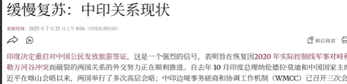 印度媒体坦言,中印关系的改善是缓慢的。如果对关键问题避而不谈,那么整个恢复关系的进程可能会面临风险。7月25日,根据印度教徒报报道,印媒表示,印度决定重启对中国公民发放旅游签证,这是一个强烈的信号,这表明因边境冲突之后,两国关系的外交努力正在顺利推进。